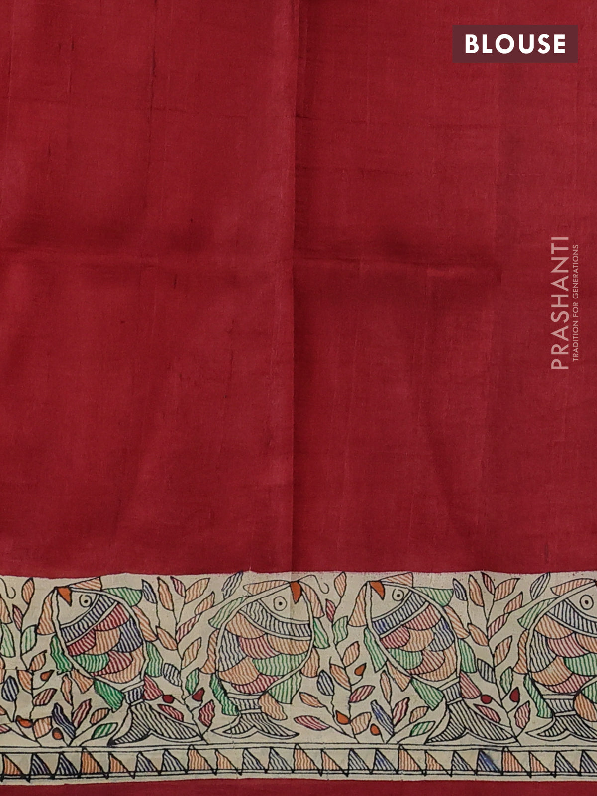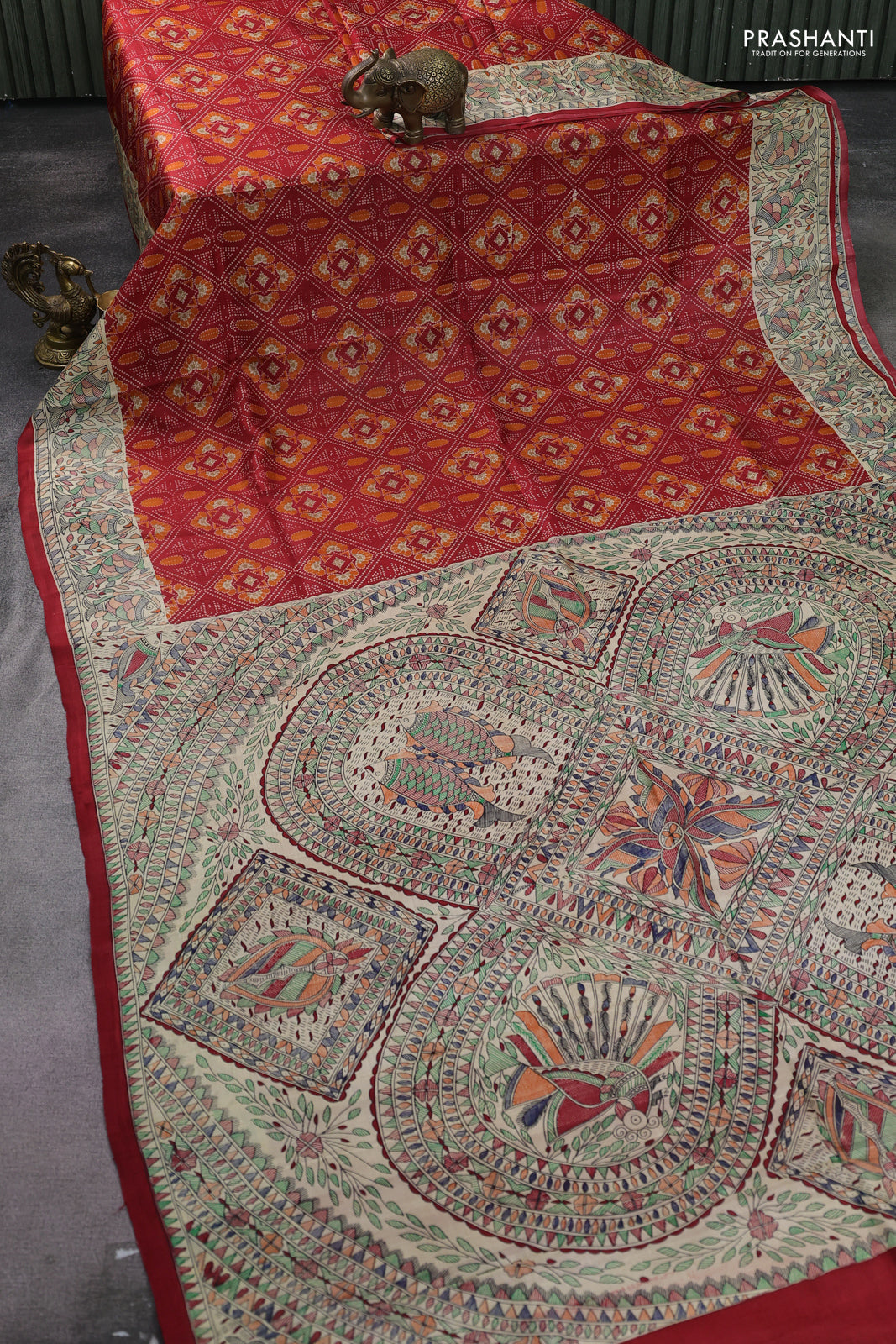 Printed silk saree red and cream with allover prints and madhubani printed pallu & border