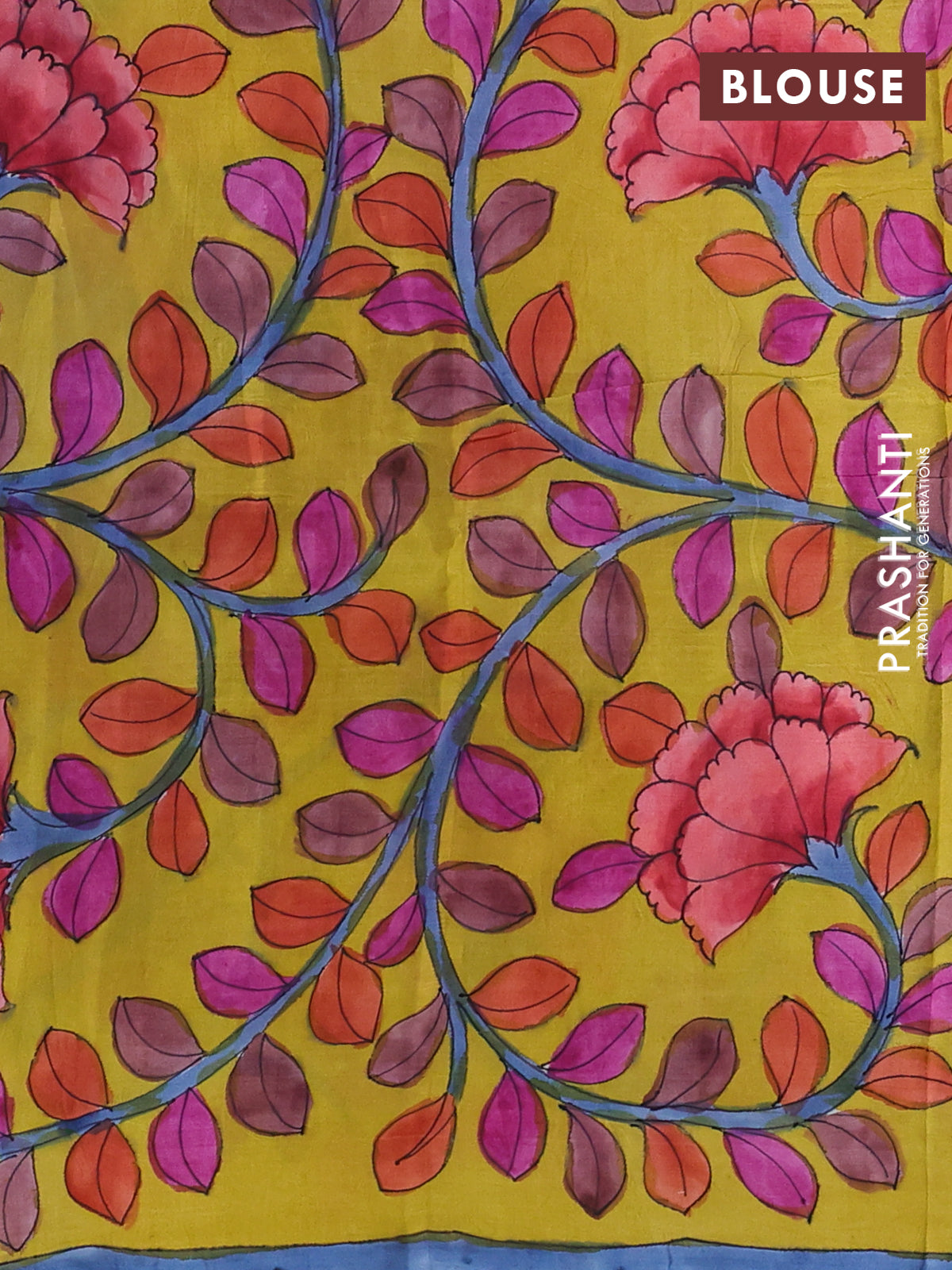 Printed silk saree royal blue and mustard yellow with shibori prints and kalamkari hand painted pallu & blouse