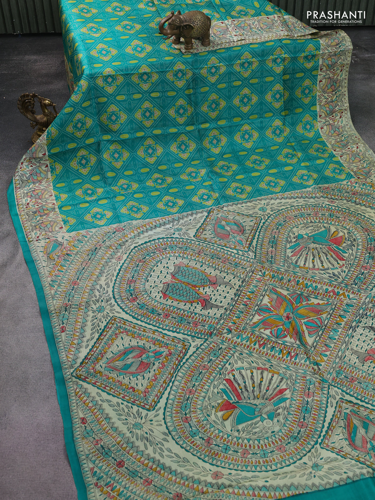 Printed silk saree teal green and cream with allover prints and madhubani printed pallu & border