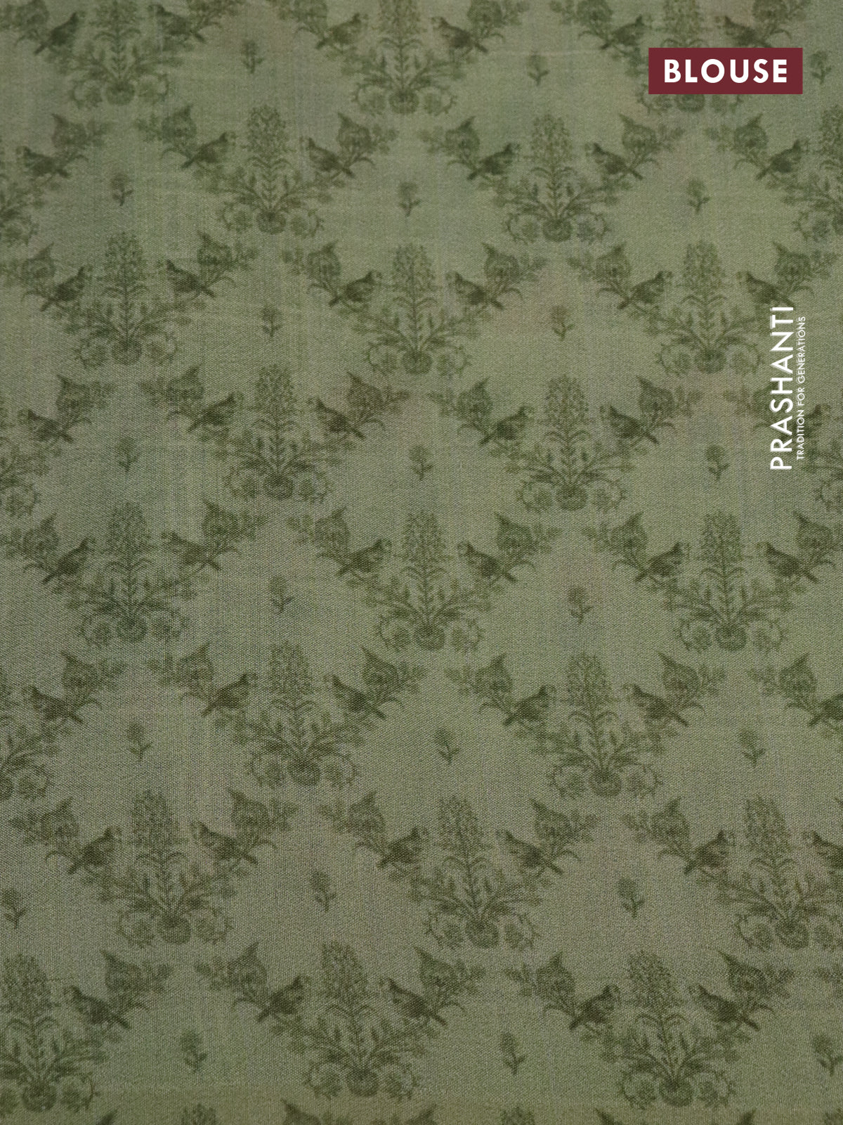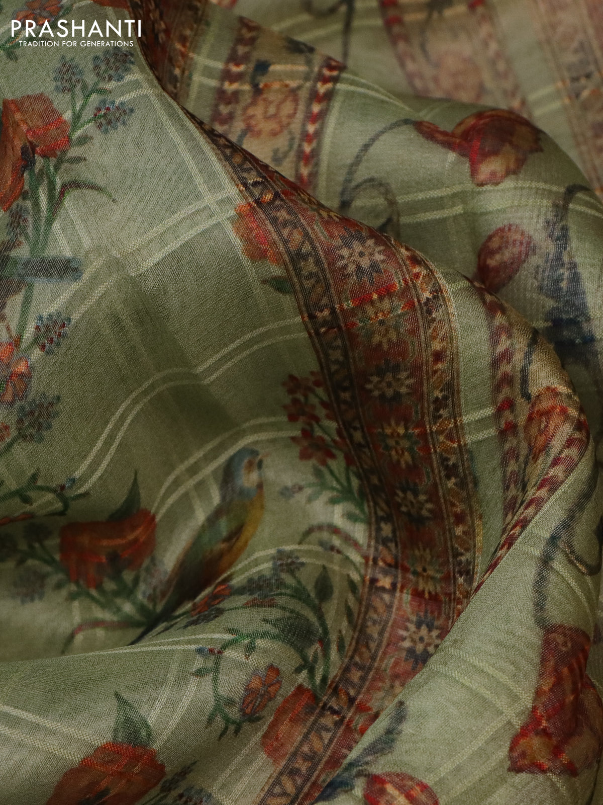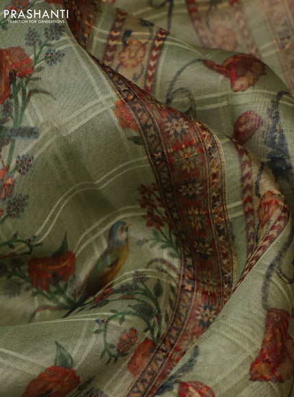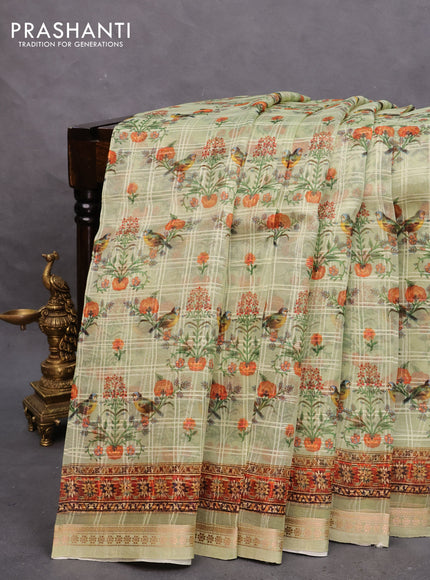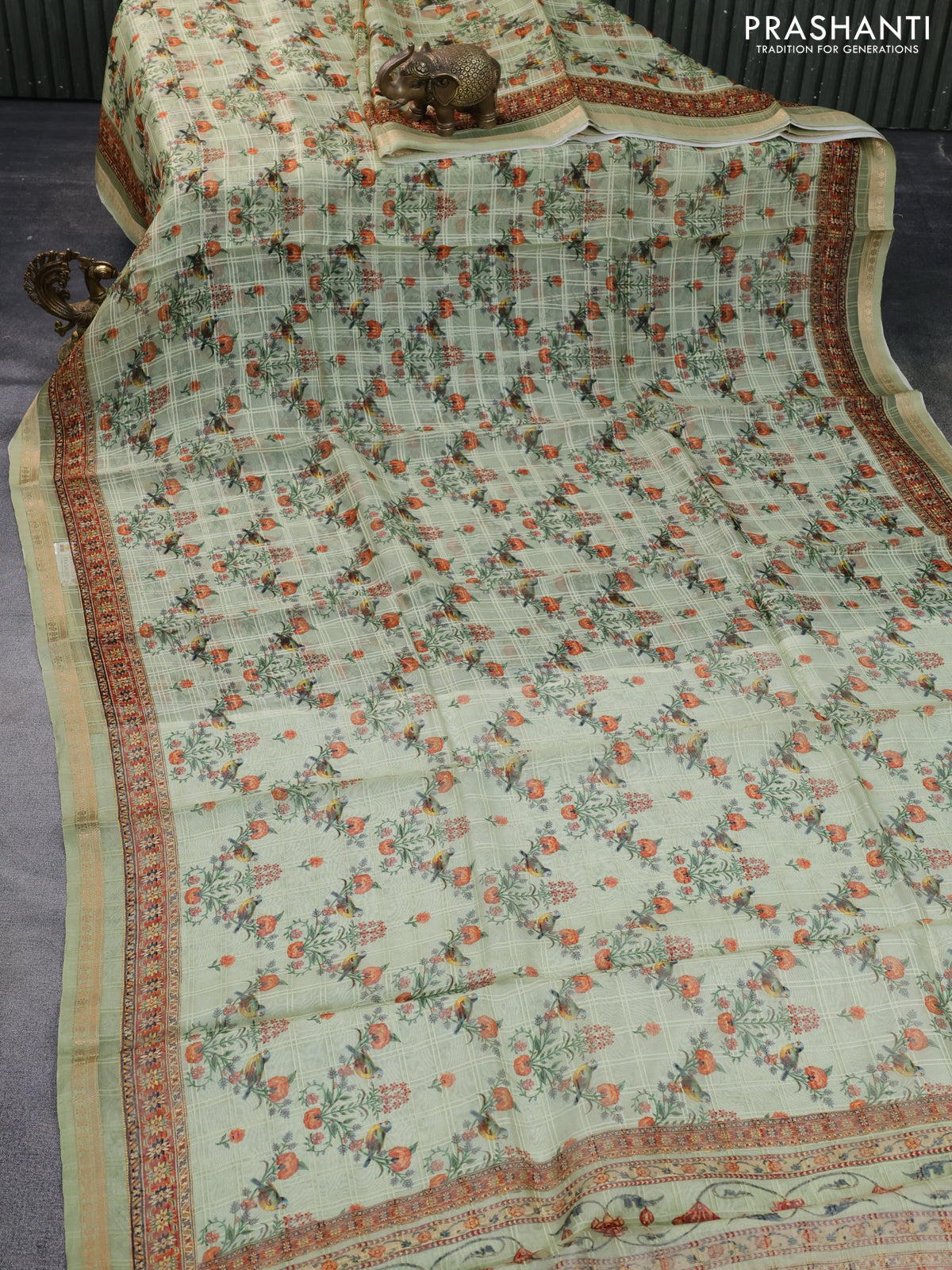 Pure banarasi organza silk saree pista green with floral digital prints and small zari woven border