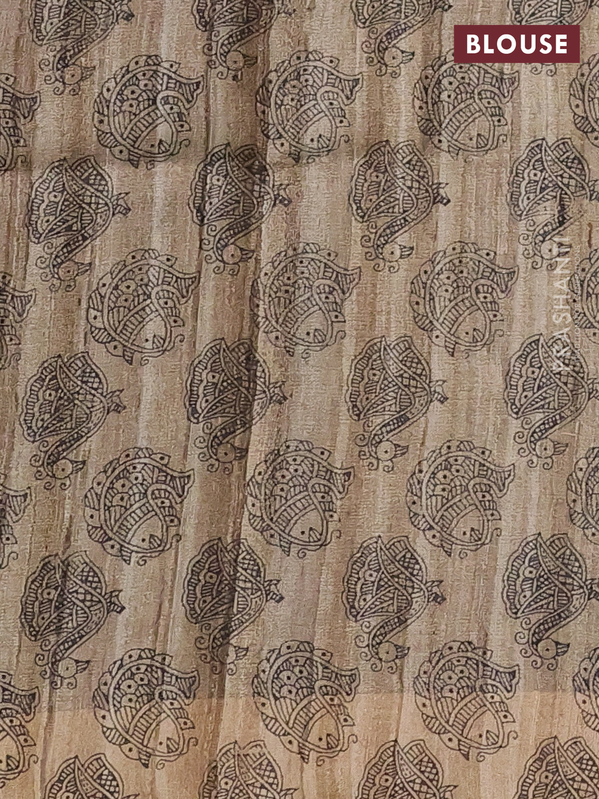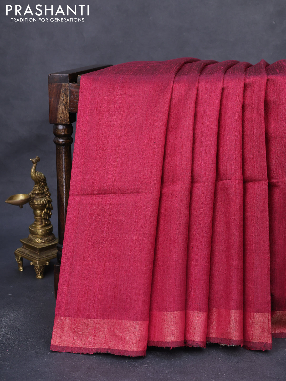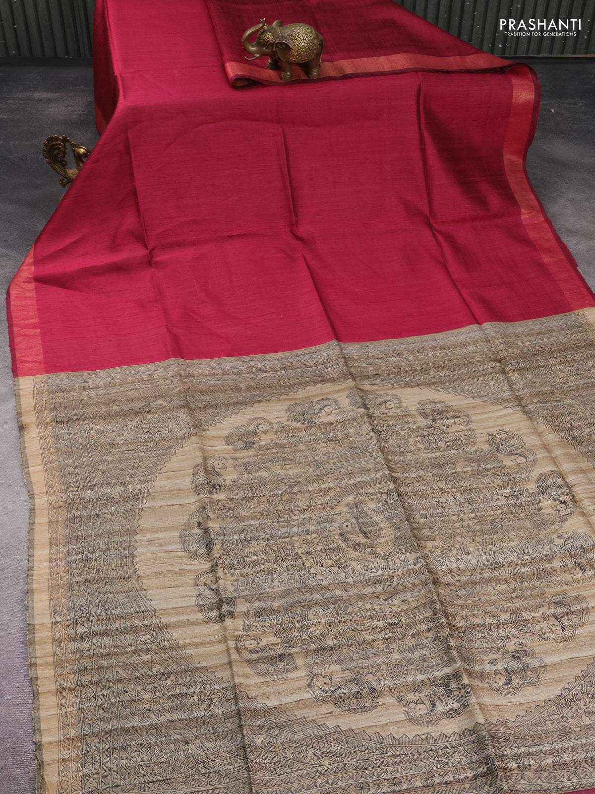 Pure dupion silk saree dark magenta pink and beige with plain body and madhubani printed pallu