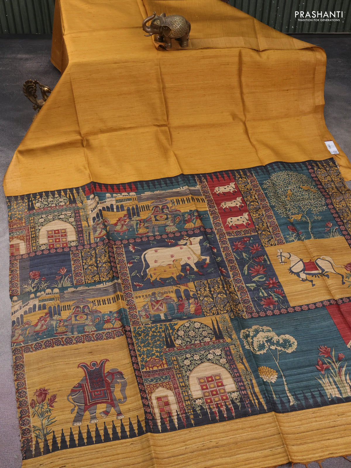 Pure dupion silk saree dark mustard with plain body and printed pallu