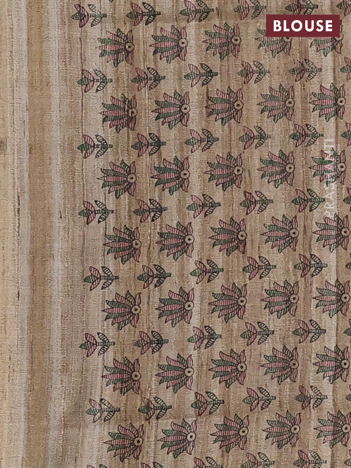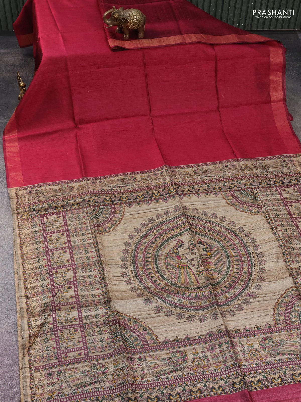 Pure dupion silk saree dark pink and beige with plain body and madhubani printed pallu