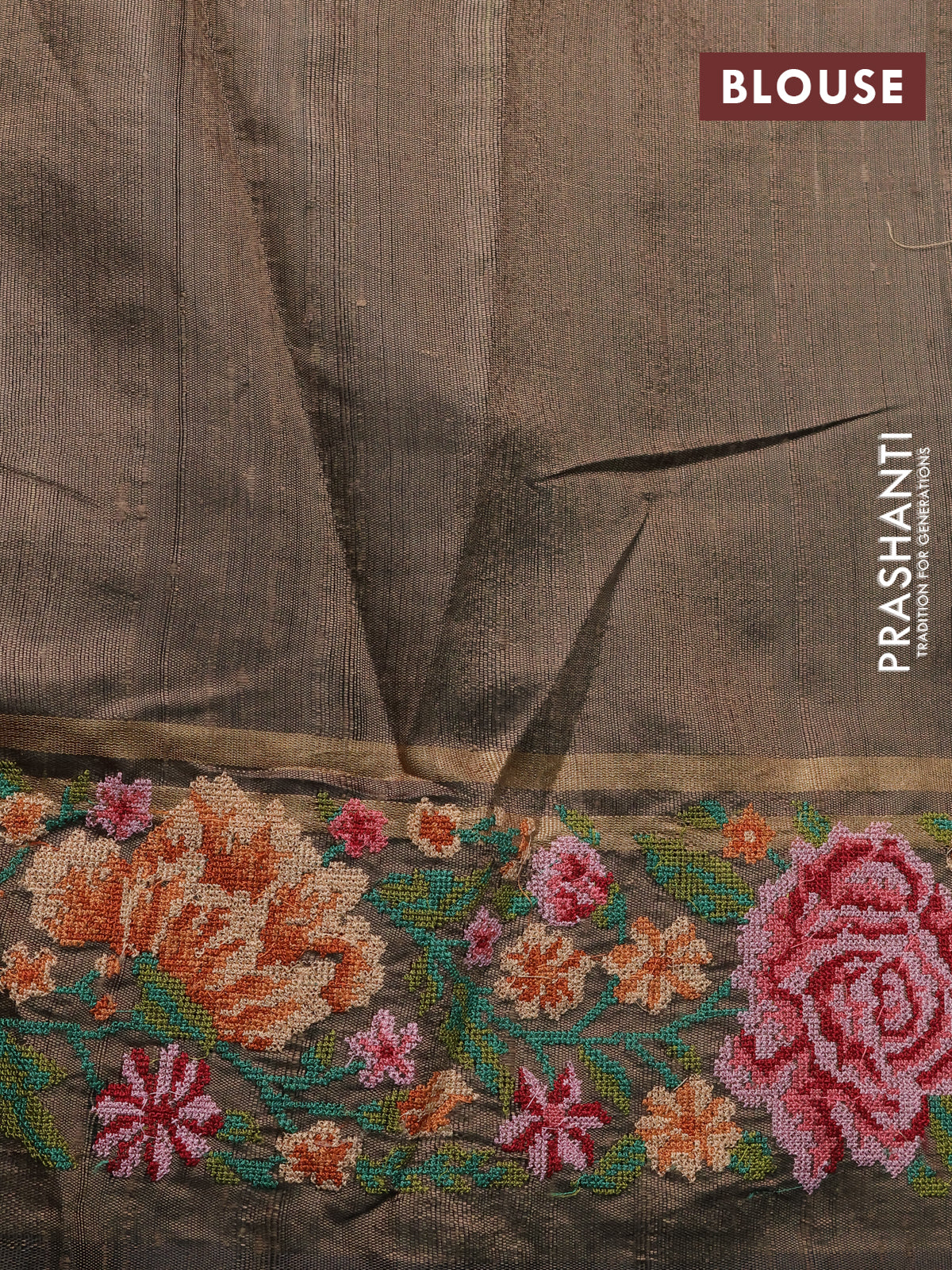 Pure dupion silk saree elaichi green with allover zari weaves and floral embrodery work border
