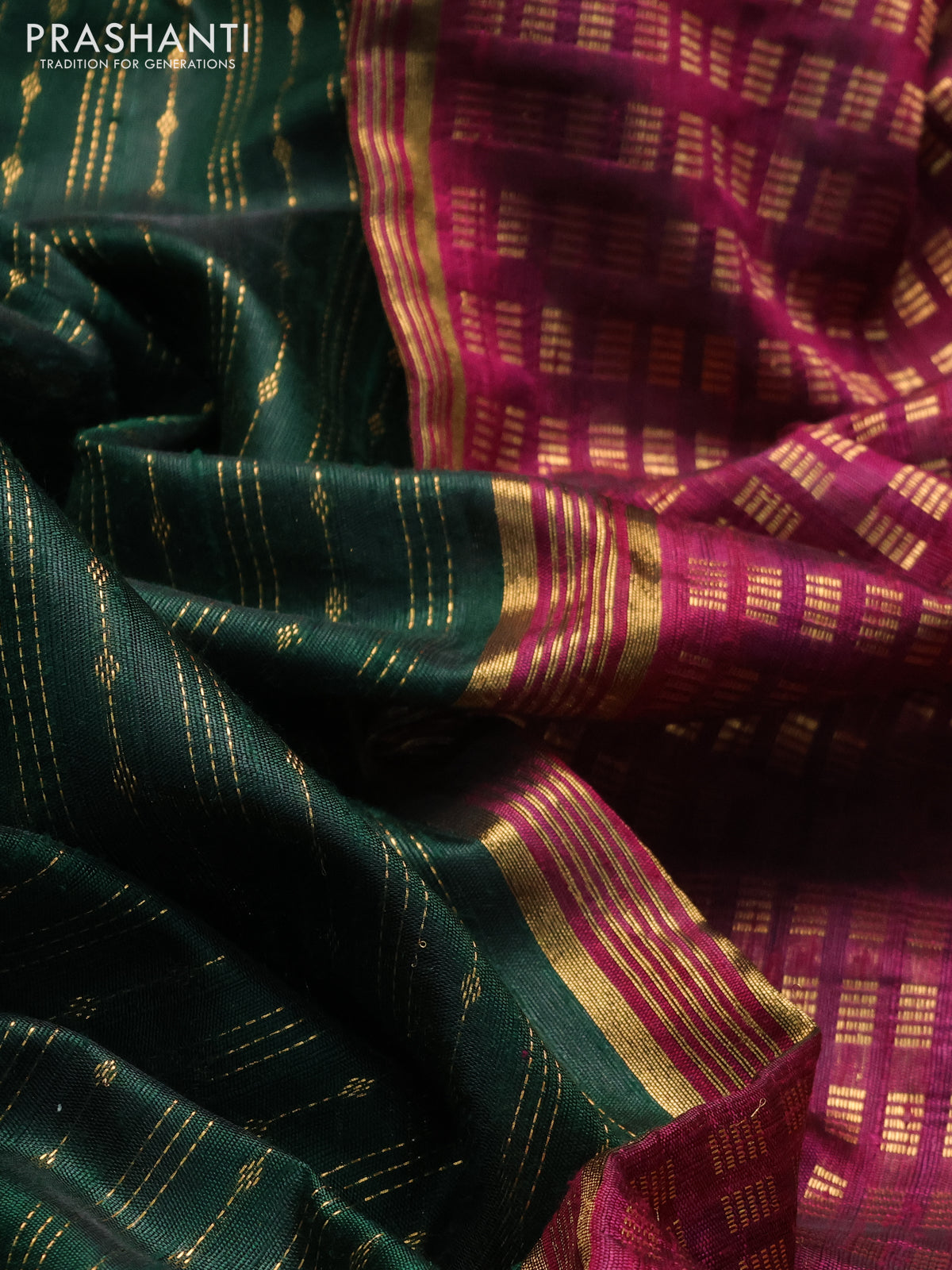 Pure dupion silk saree green and dark magenta pink with allover zari weaves and parsi work border