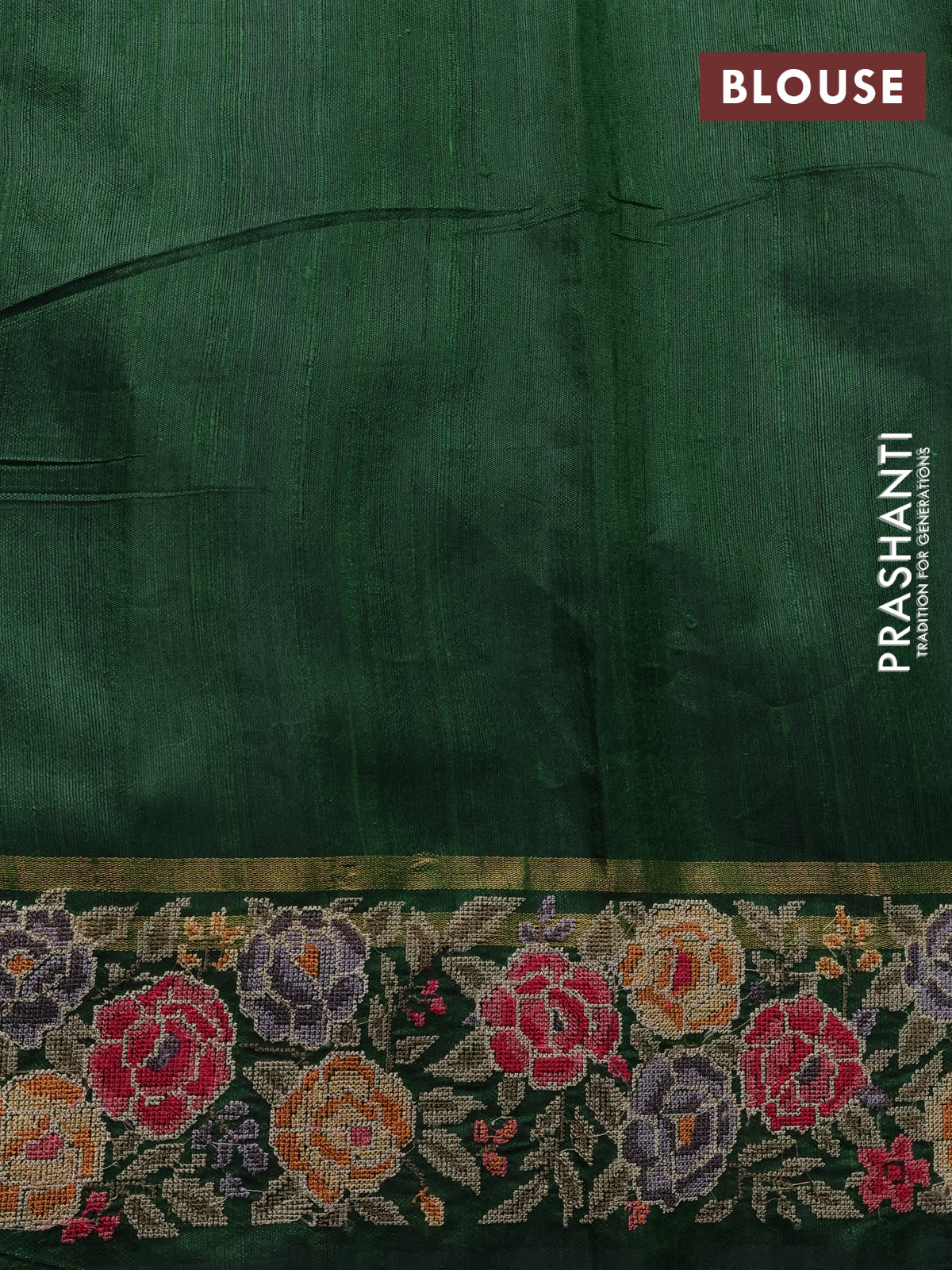Pure dupion silk saree green with allover zari weaves and floral embrodery work border