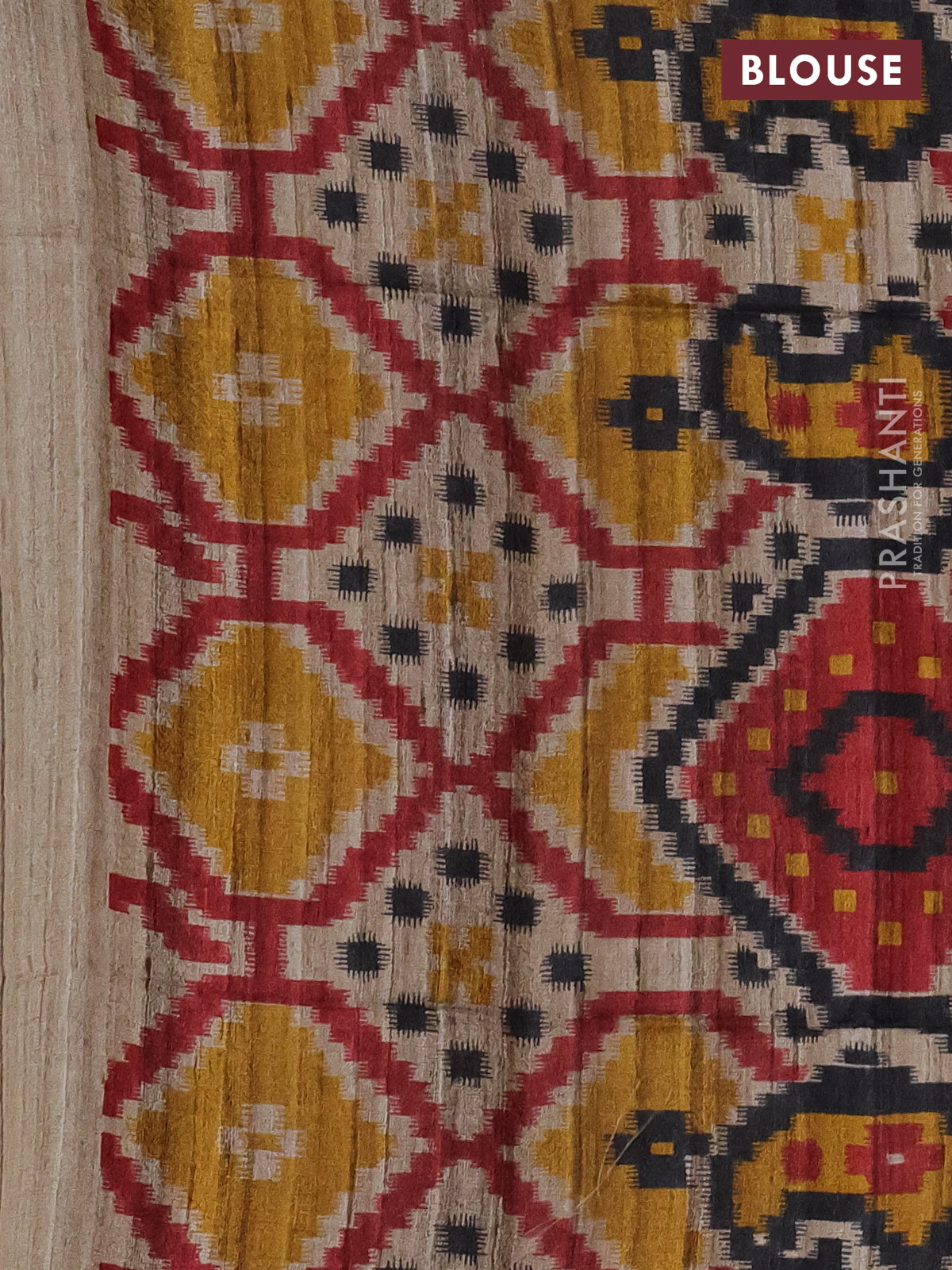 Pure dupion silk saree maroon and beige with plain body and ikat printed pallu