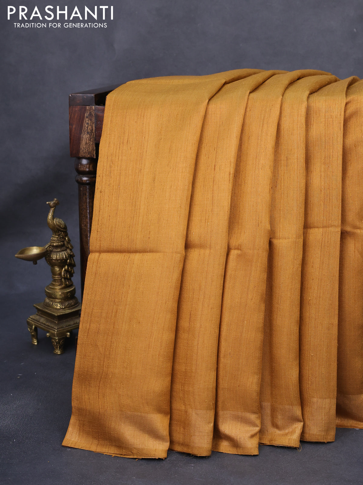 Pure dupion silk saree mustard yellow and beige with plain body and madhubani printed pallu