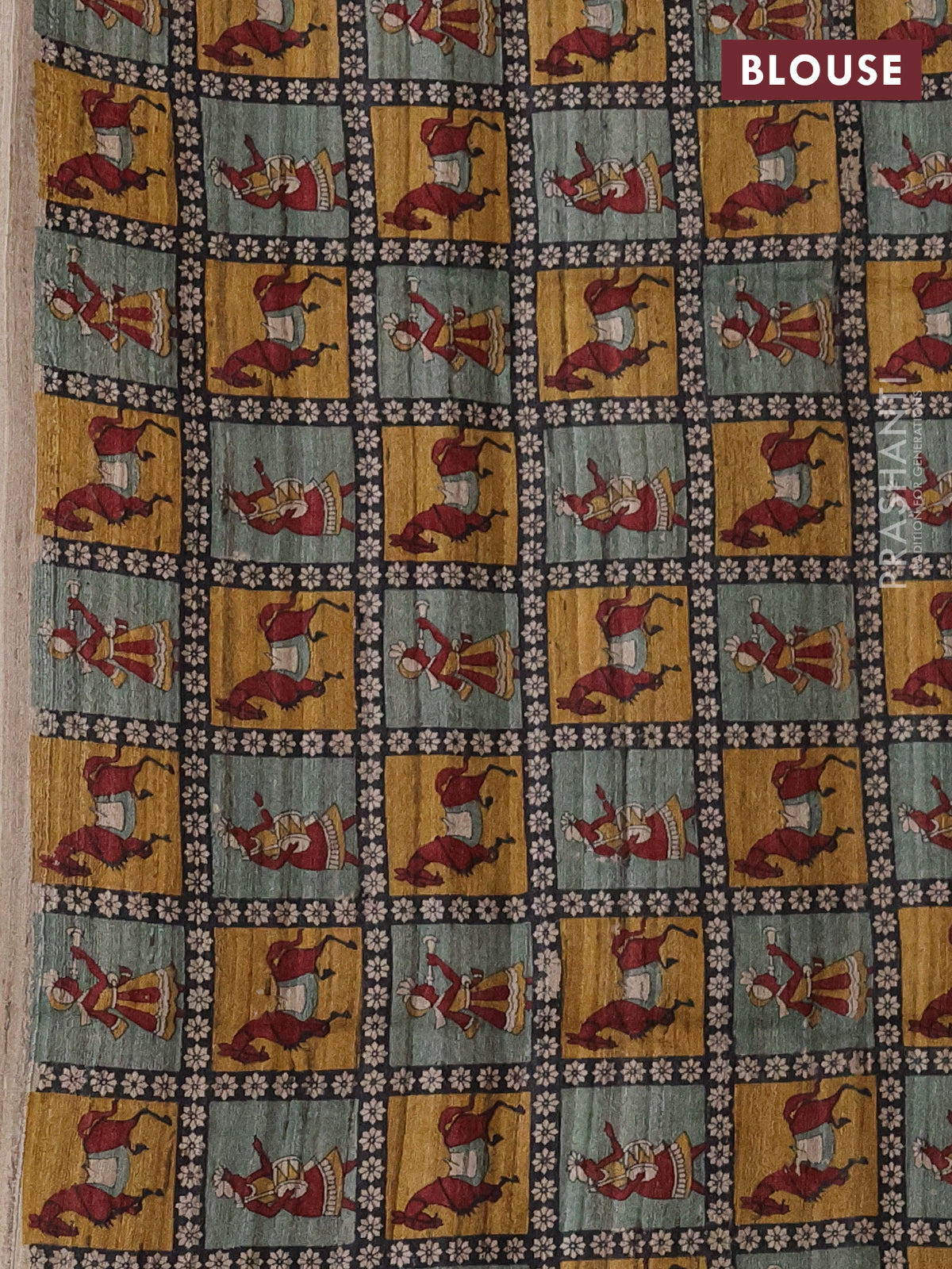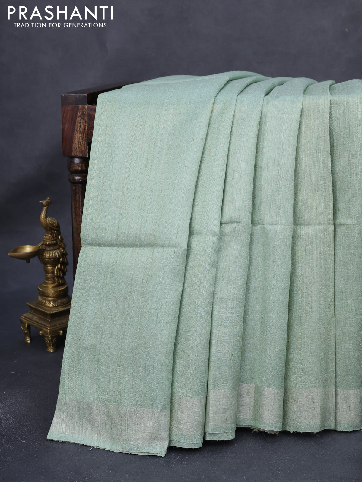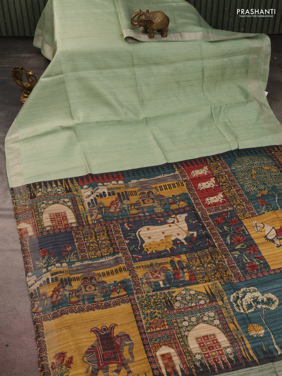Pure dupion silk saree pastel green and multi colour with plain body and kalamkari printed pallu