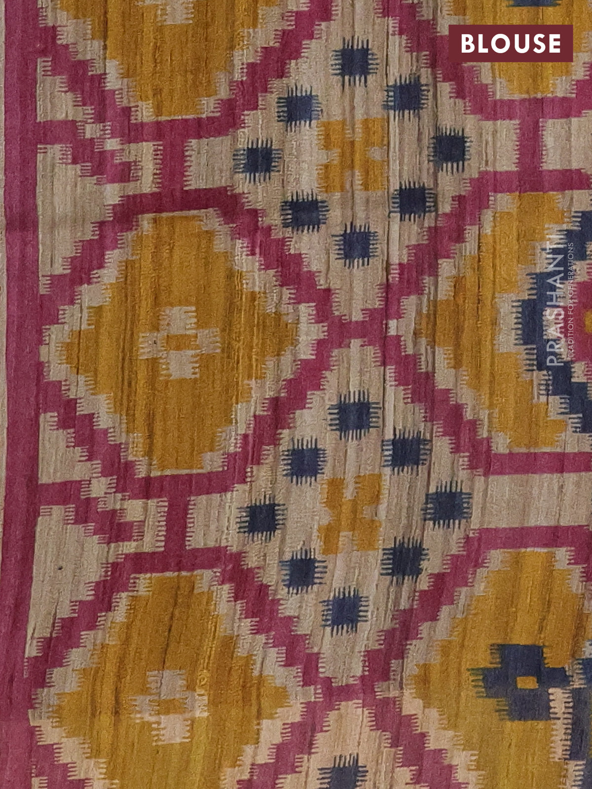 Pure dupion silk saree peacock blue and beige with plain body and ikat printed pallu