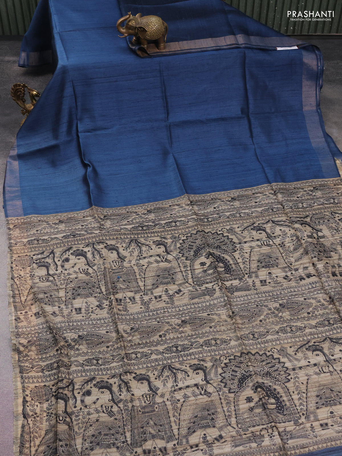 Pure dupion silk saree peacock blue and beige with plain body and madhubani printed pallu