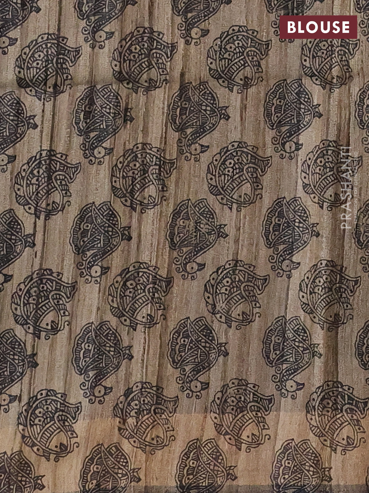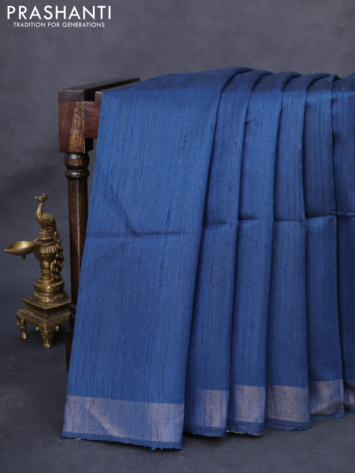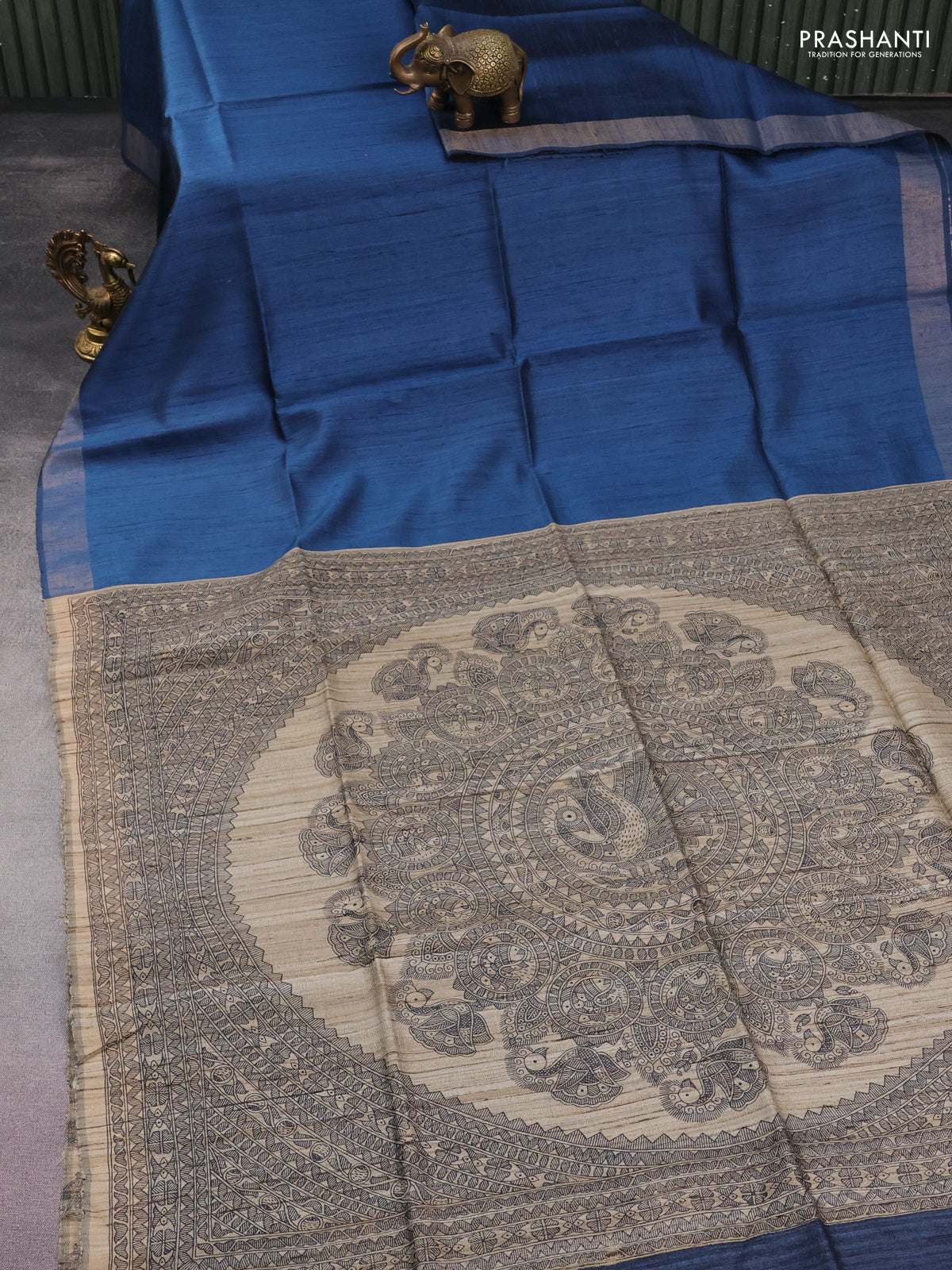 Pure dupion silk saree peacock blue and beige with plain body and madhubani printed pallu