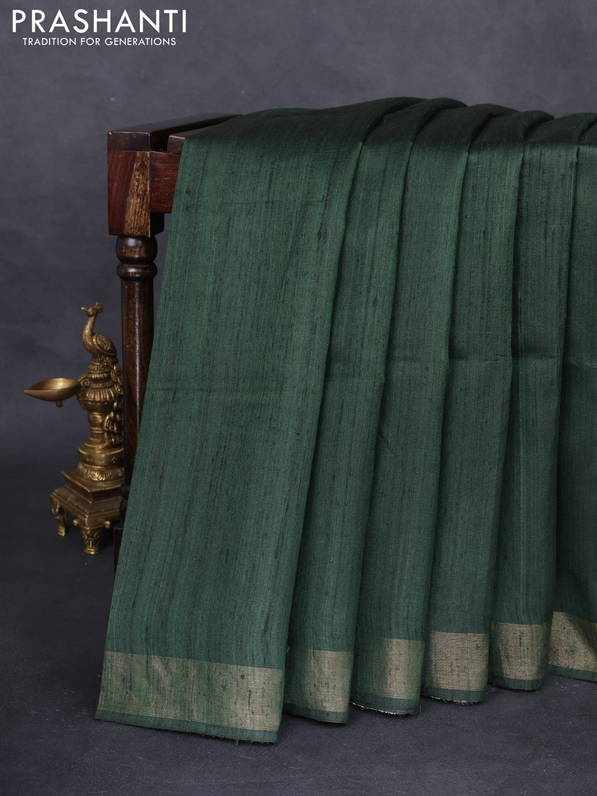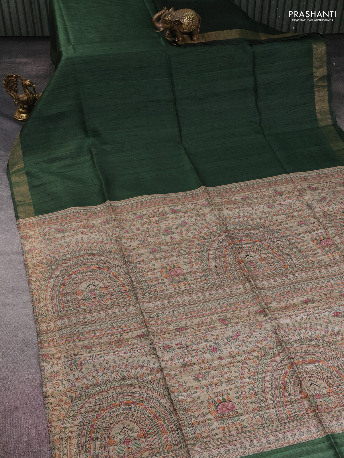 Pure dupion silk saree sap green and beige with plain body and madhubani printed pallu