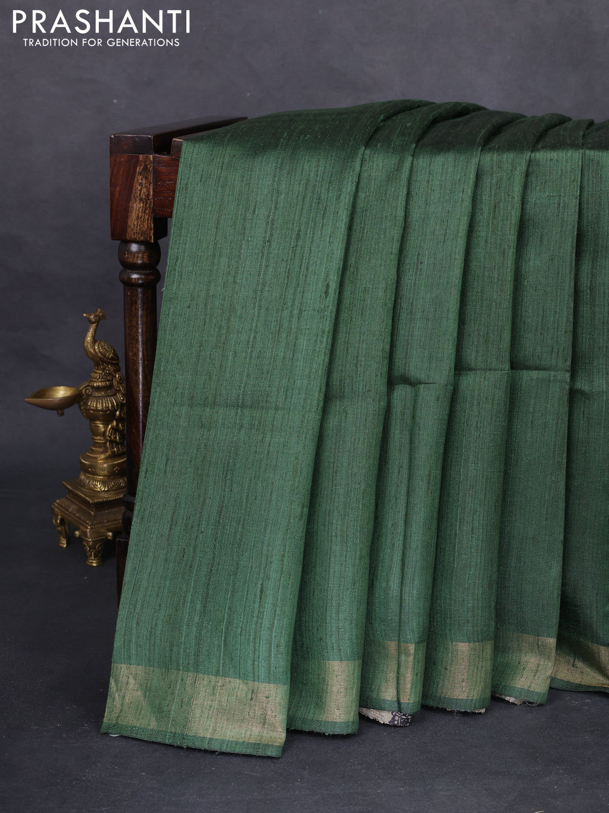 Pure dupion silk saree sap green and beige with plain body and madhubani printed pallu