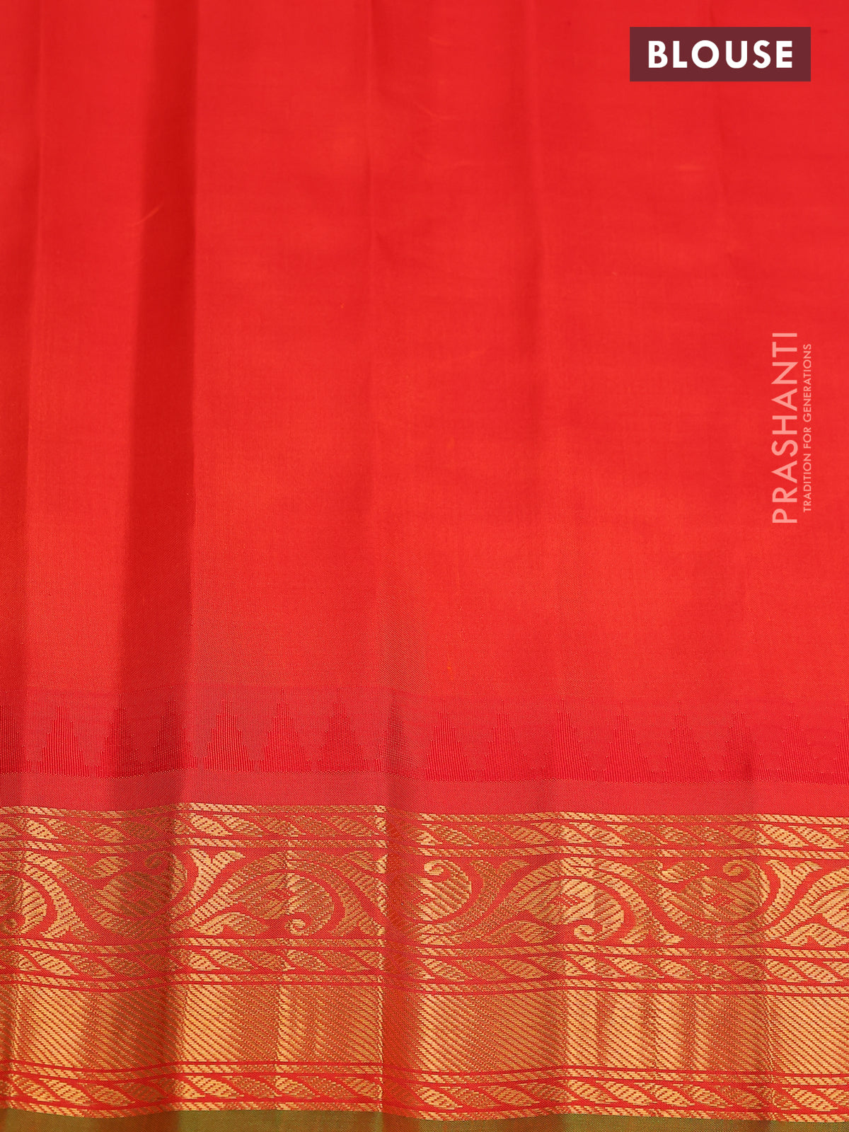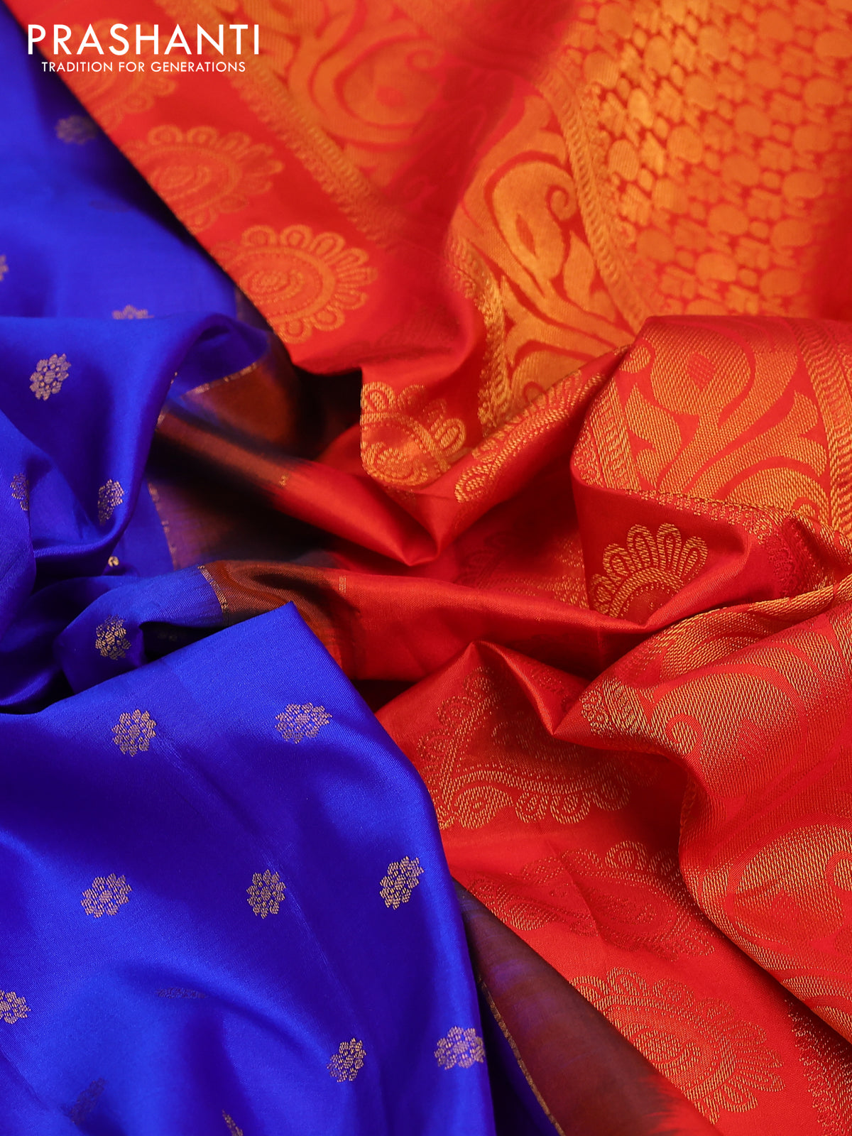 Pure gadwal silk saree blue and orange with zari woven buttas and temple design zari woven border