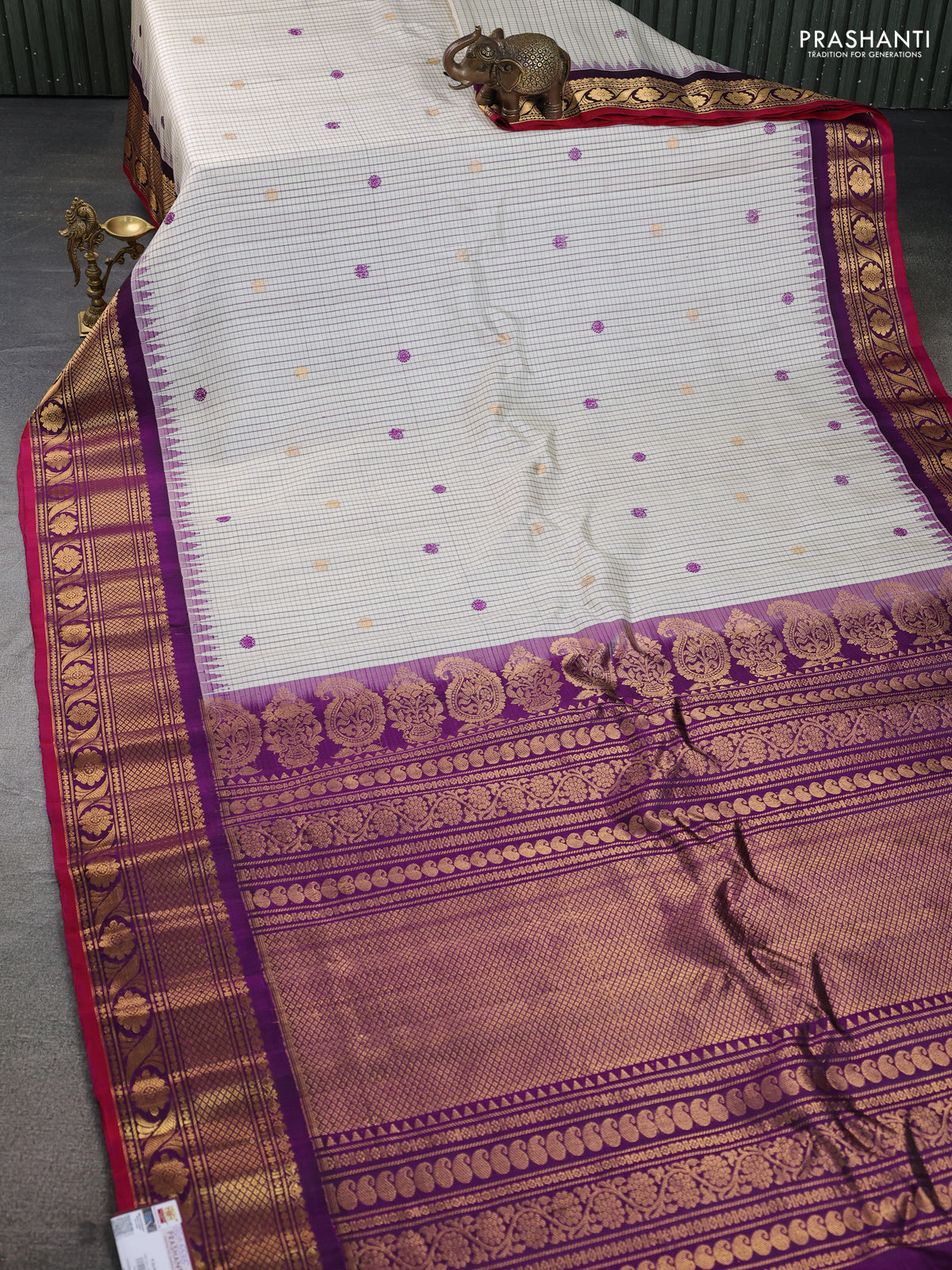 Pure gadwal silk saree cream and purple with allover checks & buttas and temple design zari woven border