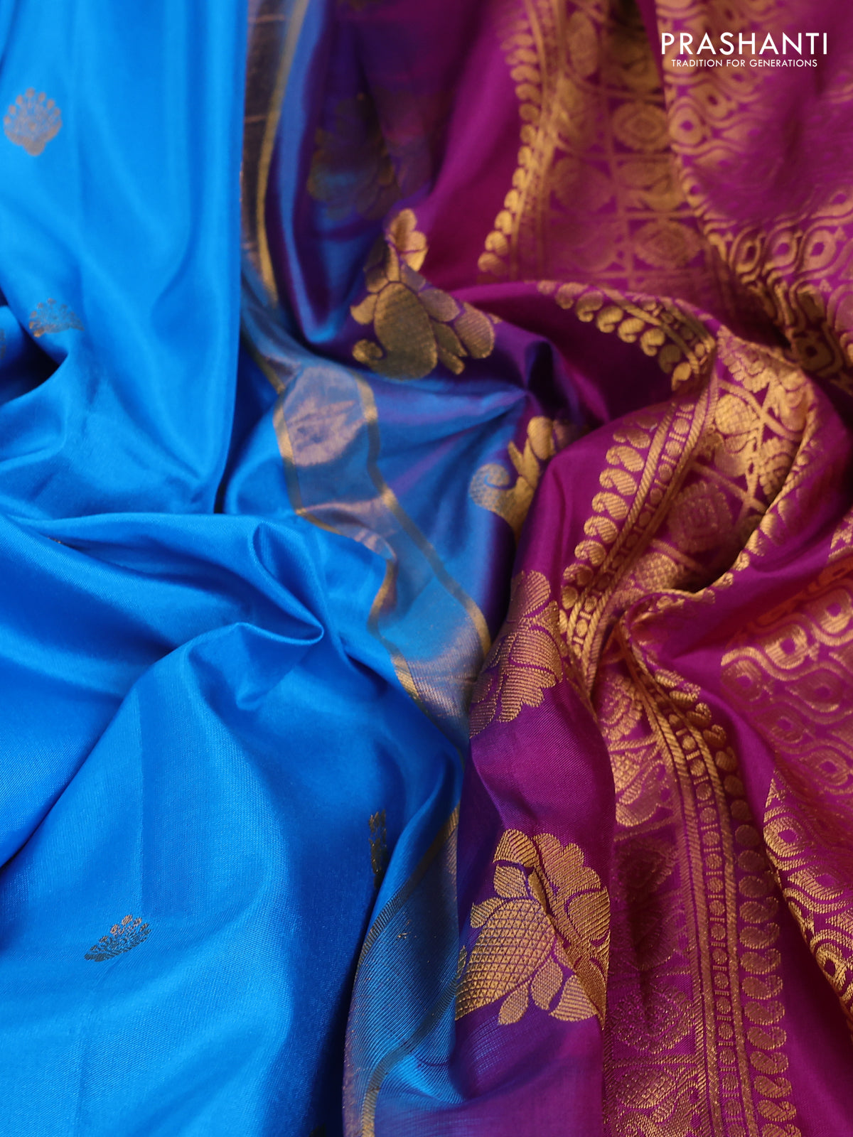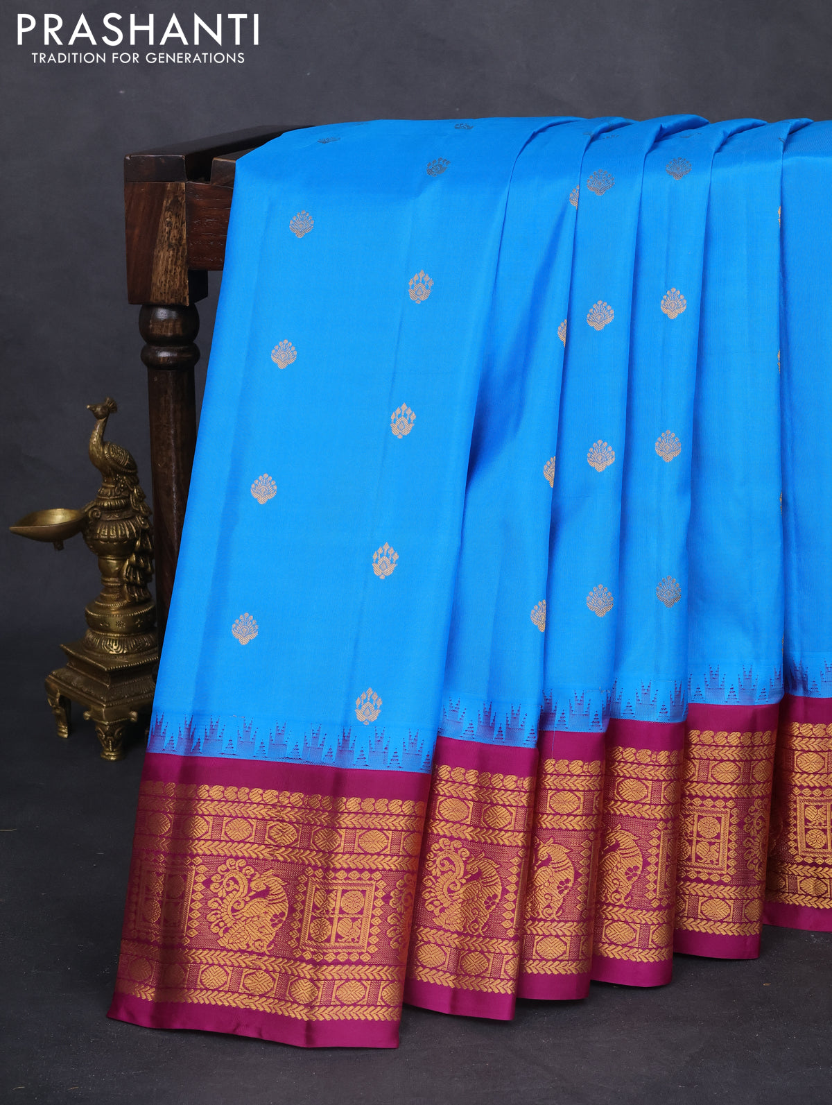 Pure gadwal silk saree cs blue and purple with zari woven buttas and temple design zari woven border