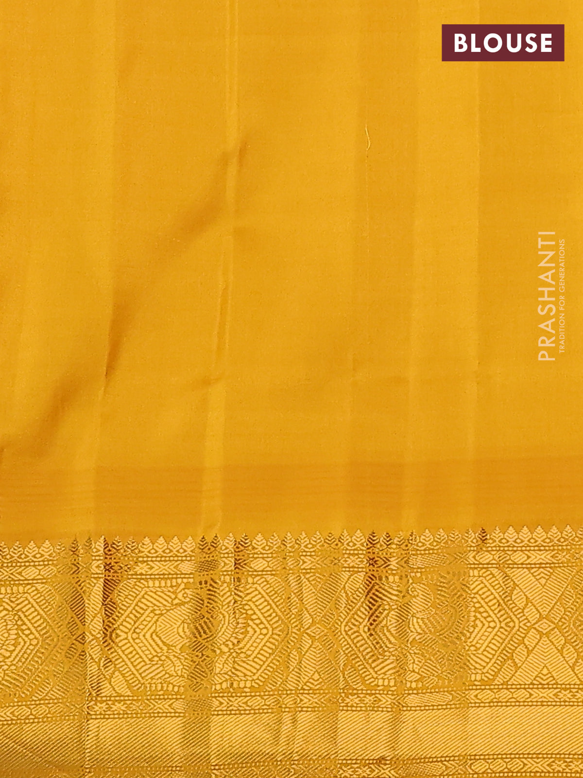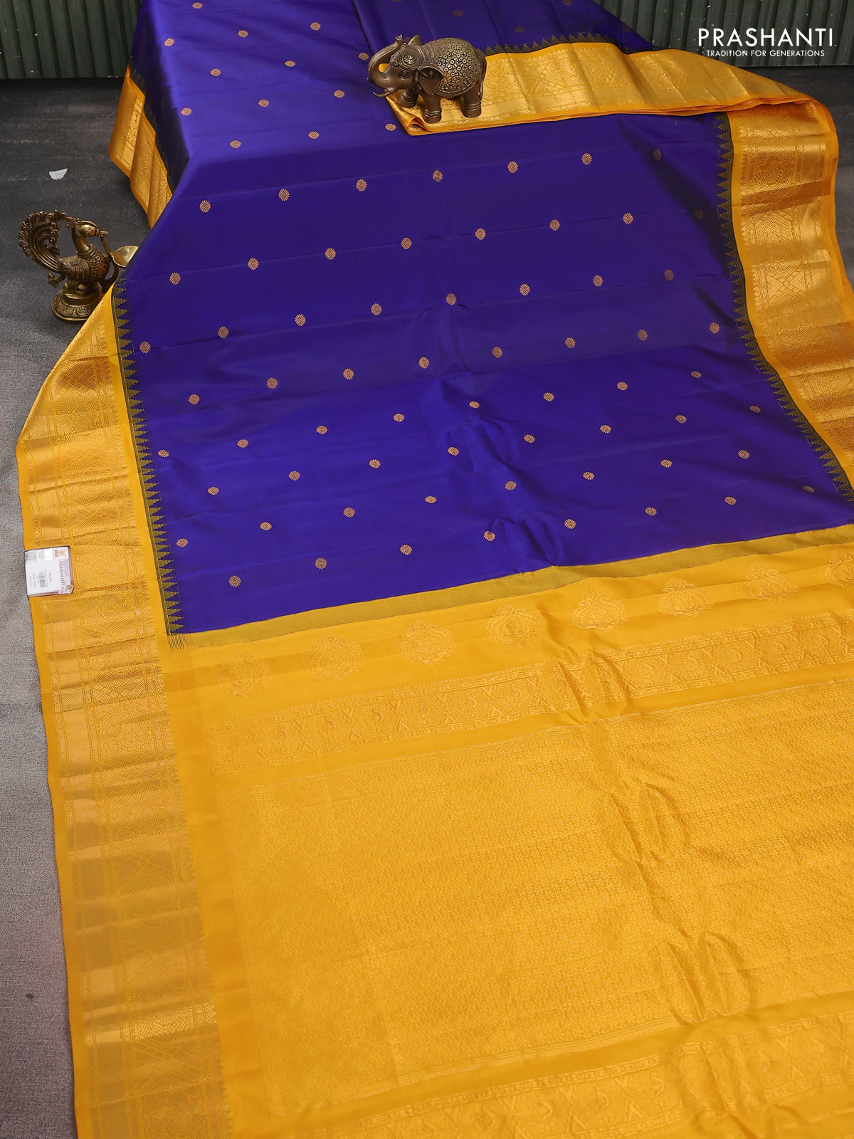 Pure gadwal silk saree dark blue and mustard yellow with zari woven buttas and temple design zari woven border