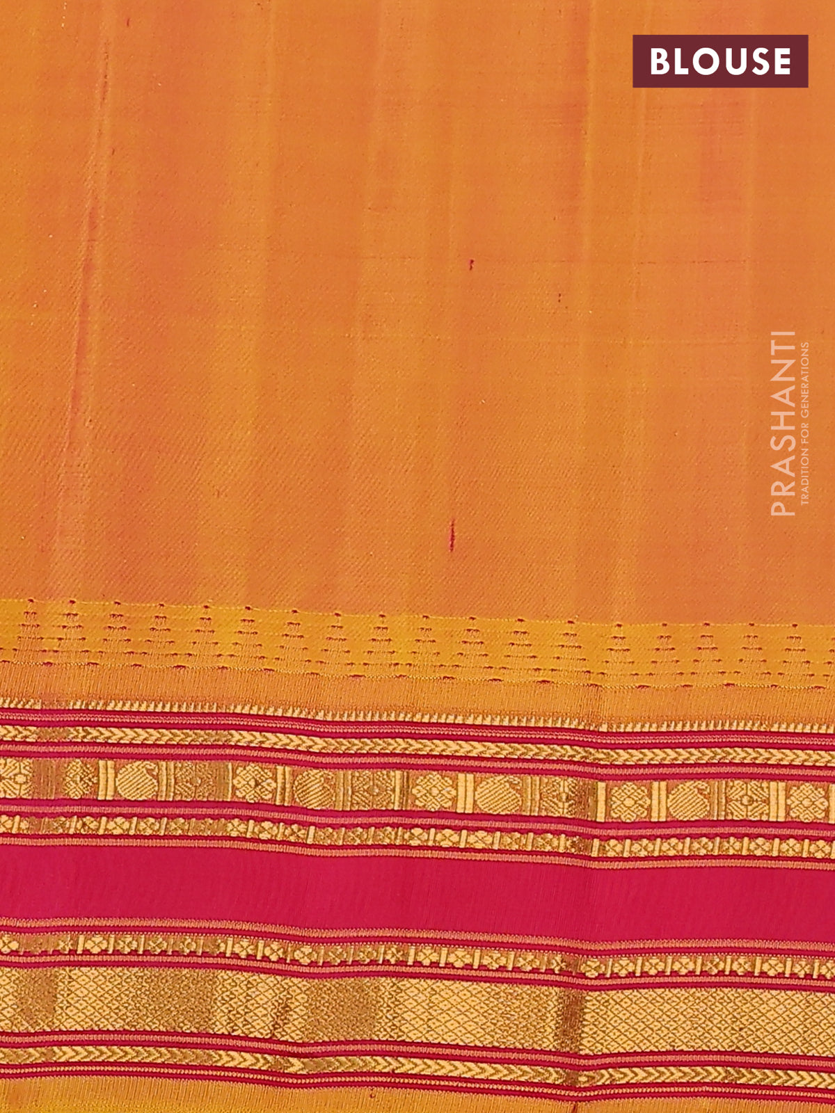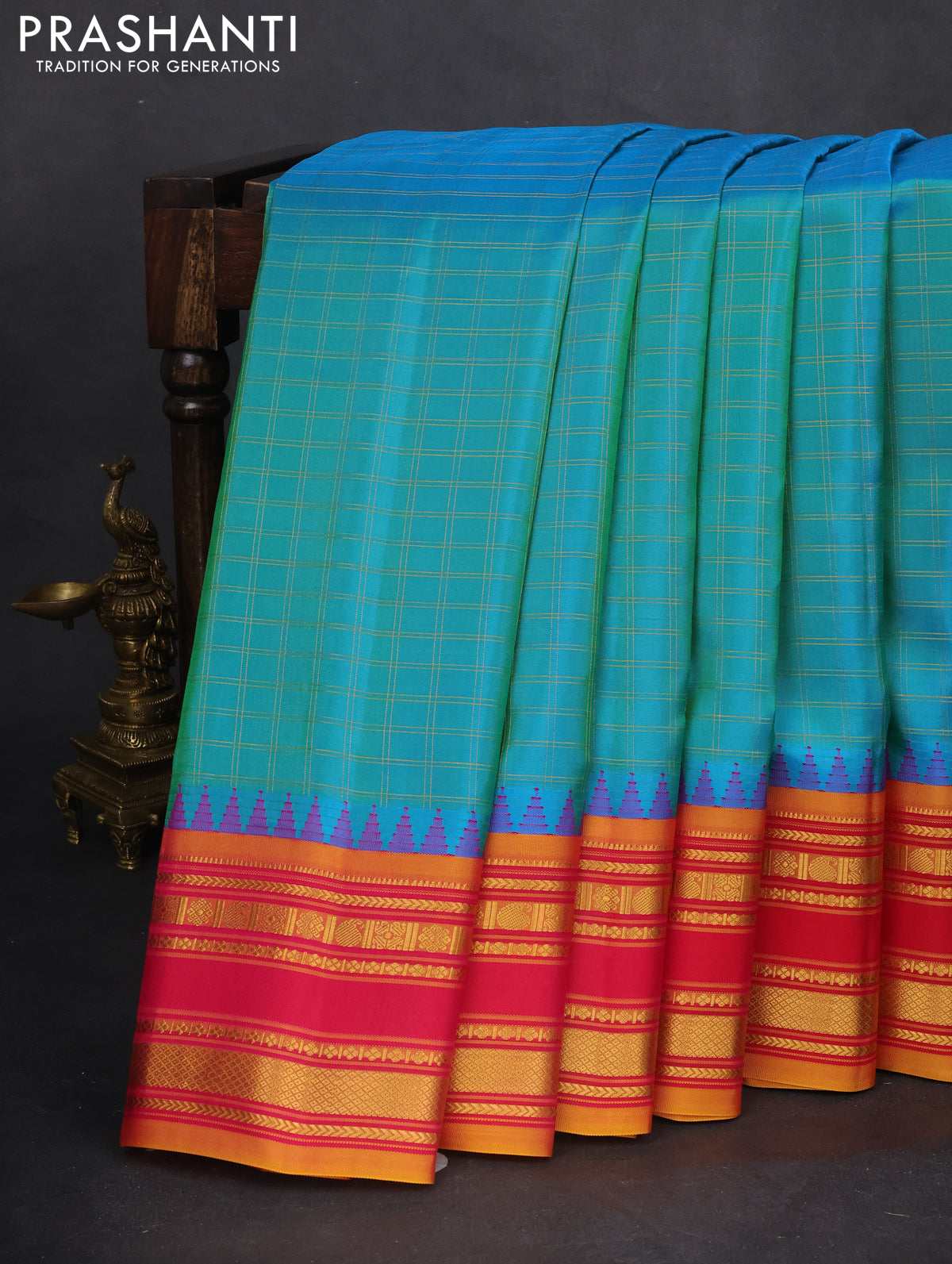 Pure gadwal silk saree dual shade of teal green and pink with allover zari checked pattern and temple design zari woven border