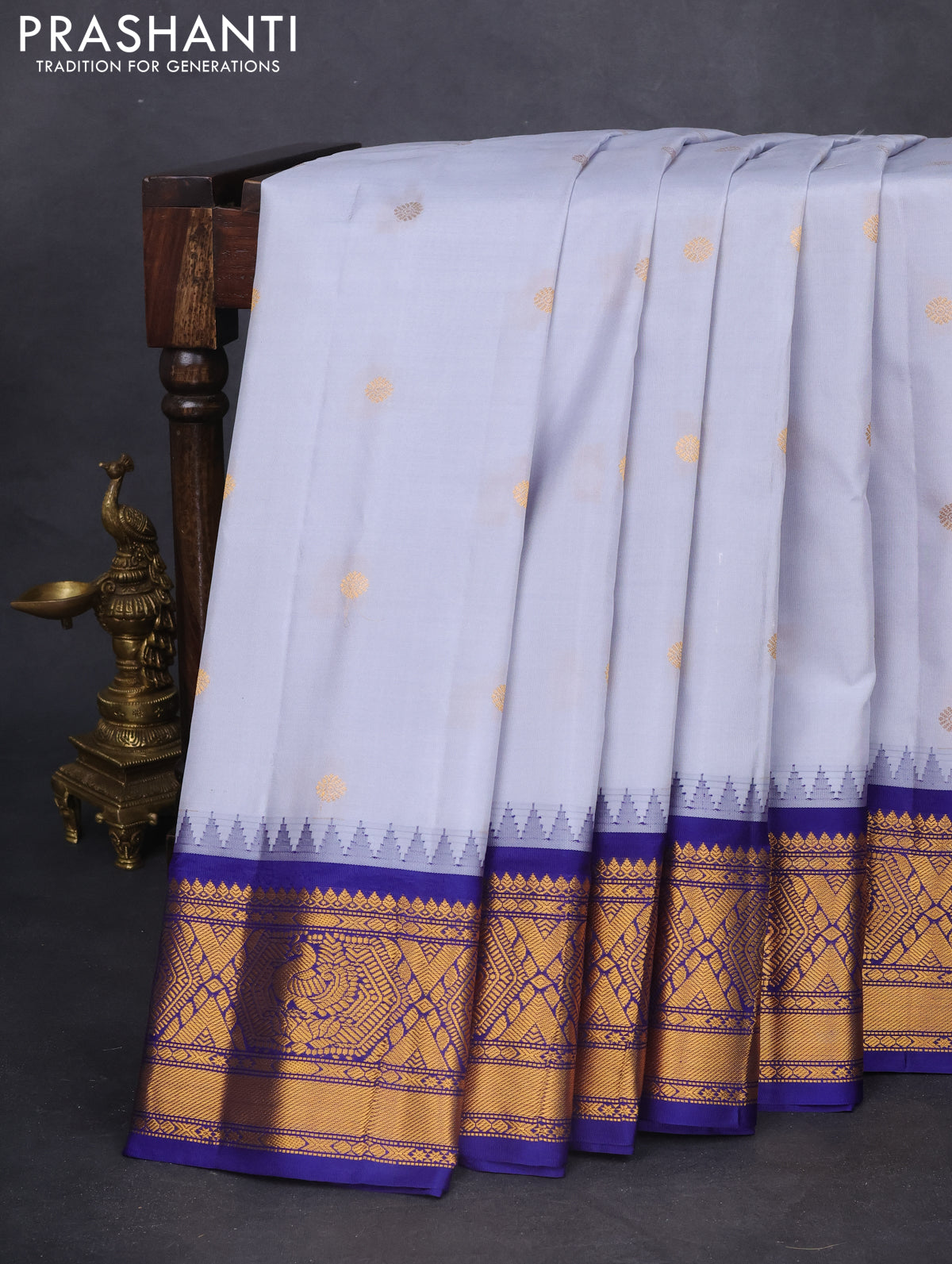 Pure gadwal silk saree grey and dark blue with zari woven buttas and temple design zari woven border