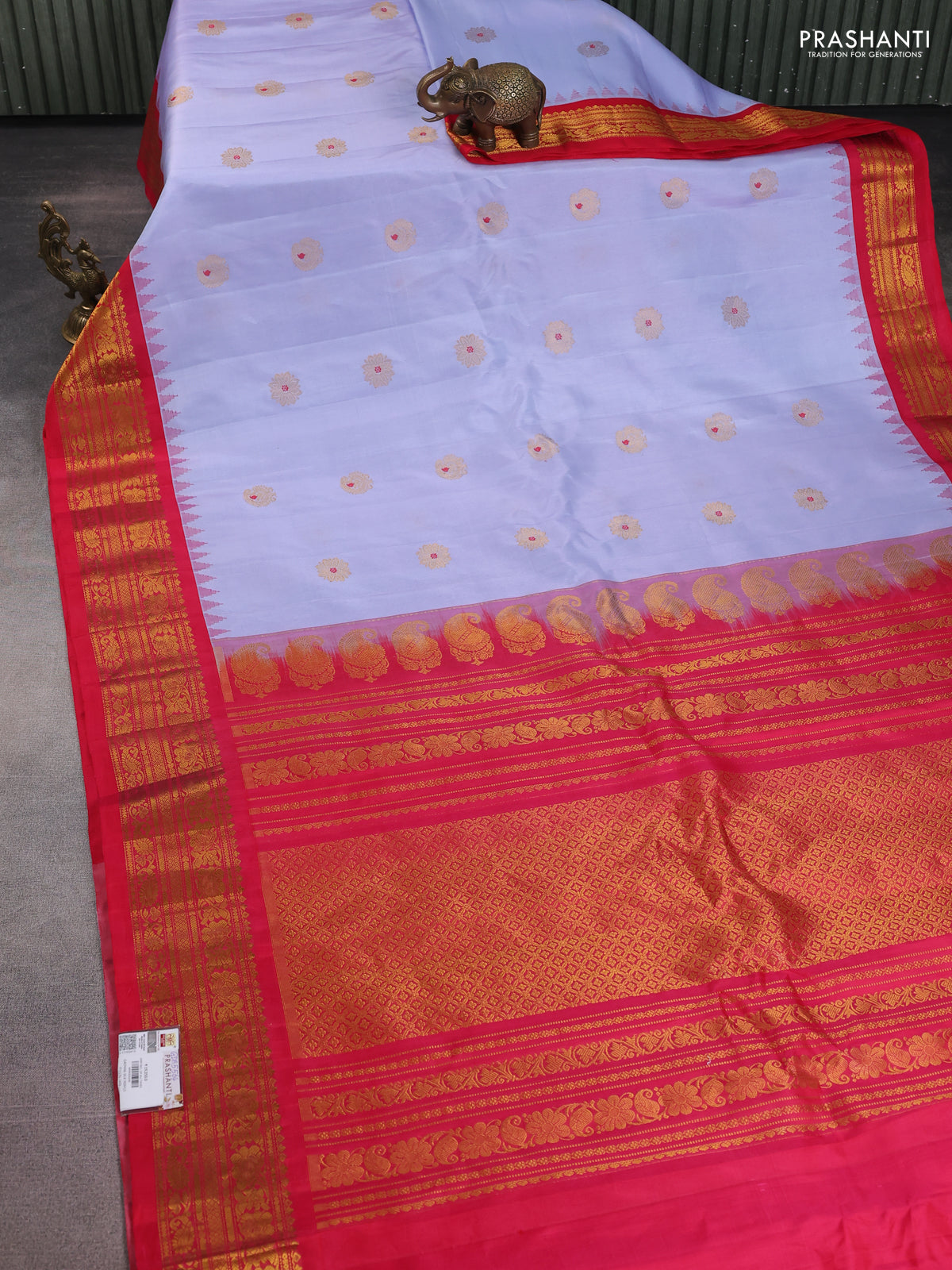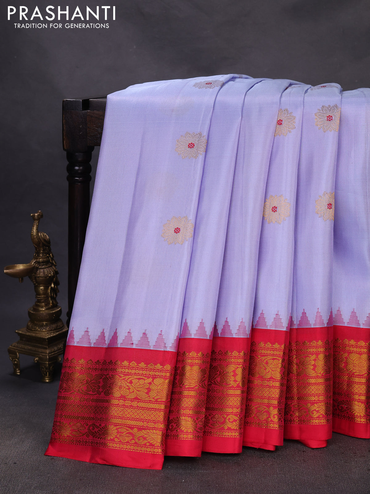 Pure gadwal silk saree lavender and red with zari woven buttas and temple design zari woven border