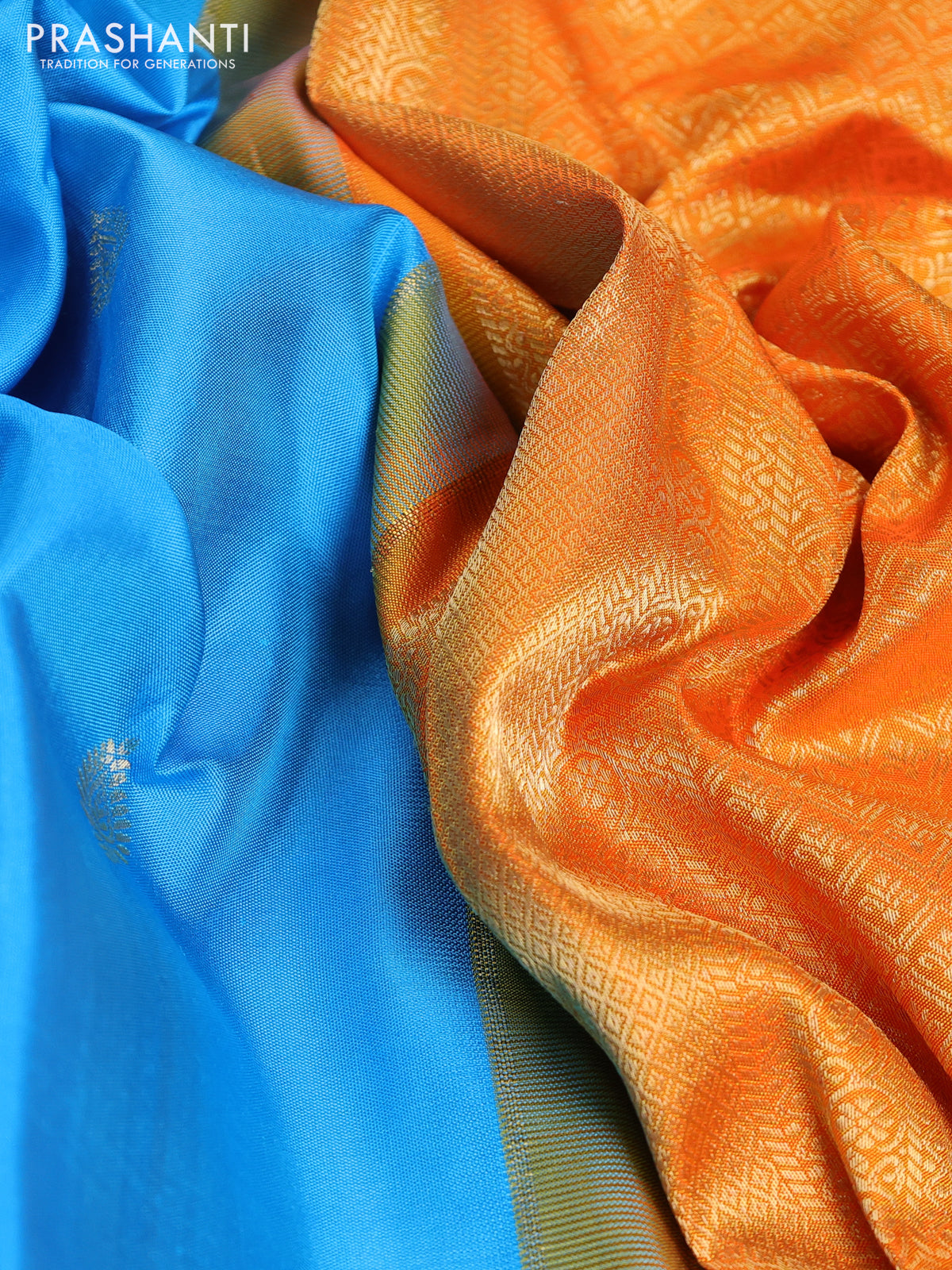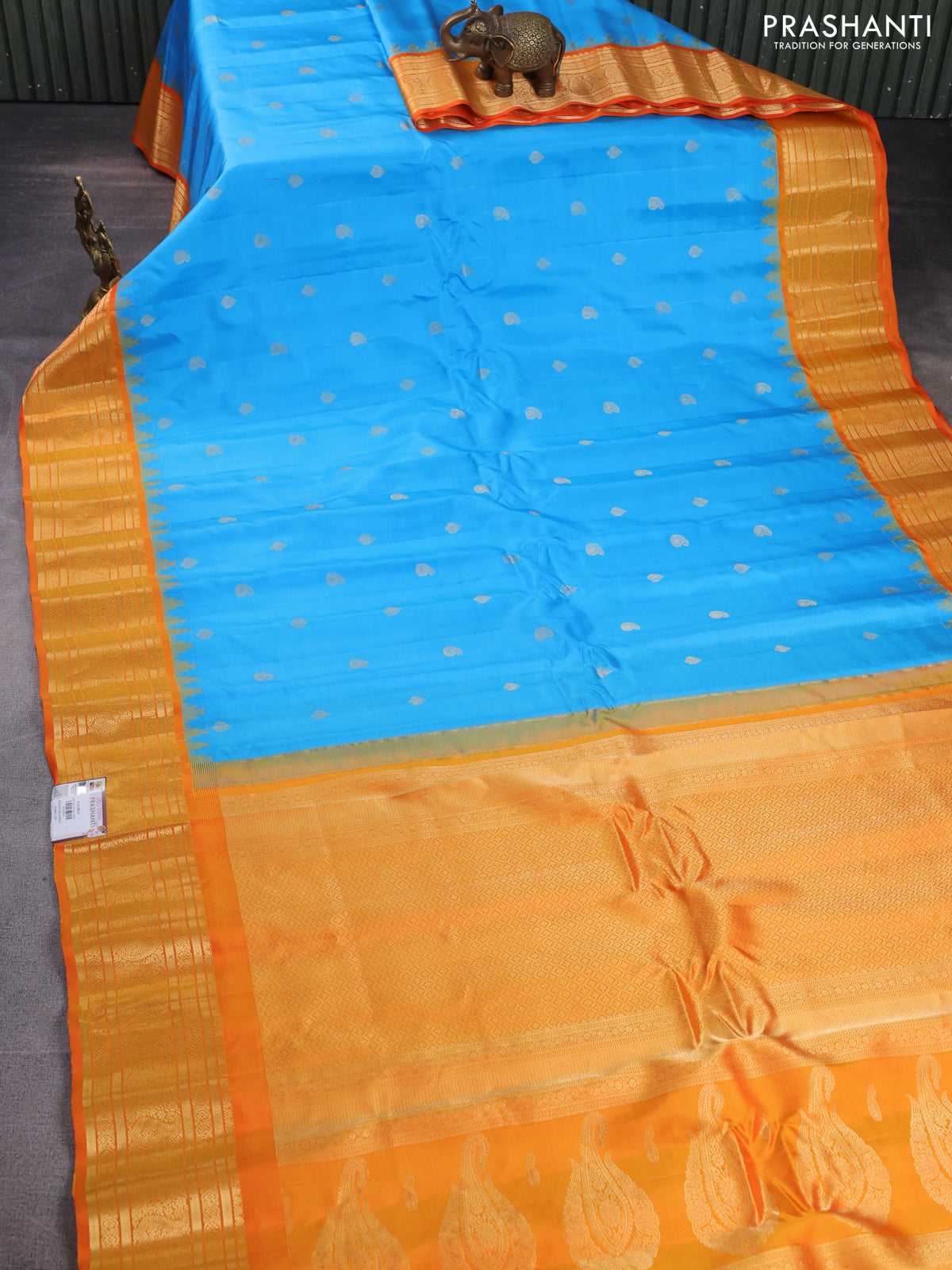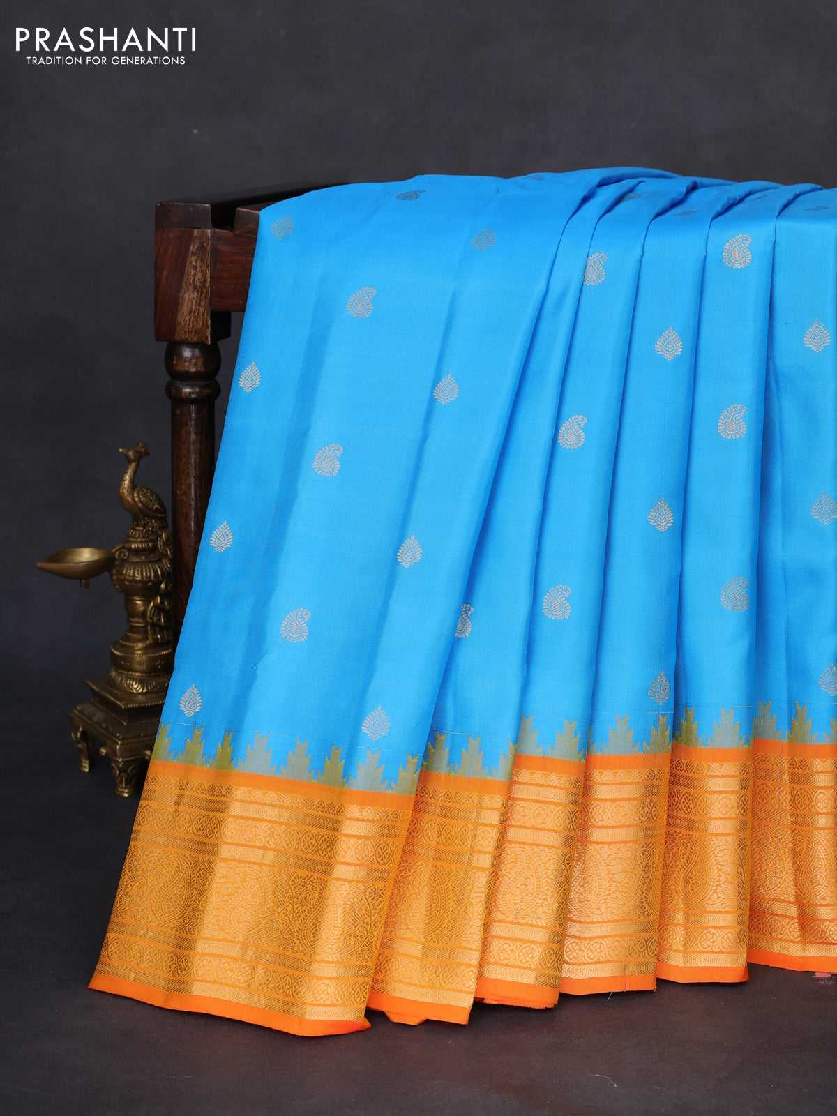 Pure gadwal silk saree light blue and orange with zari woven buttas and temple design zari woven border