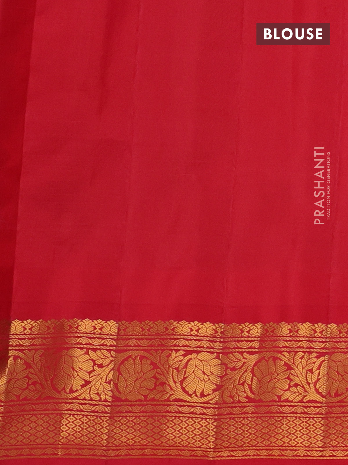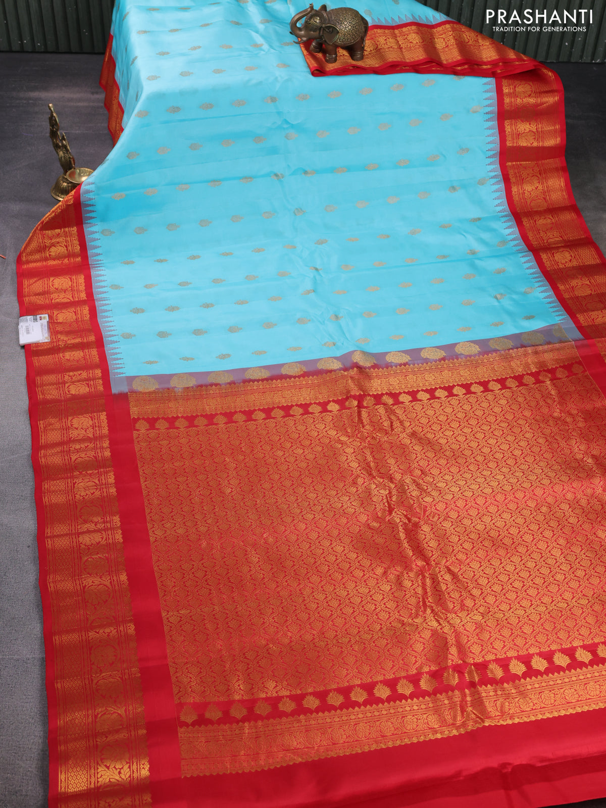 Pure gadwal silk saree light blue and red with zari woven buttas and temple design zari woven border