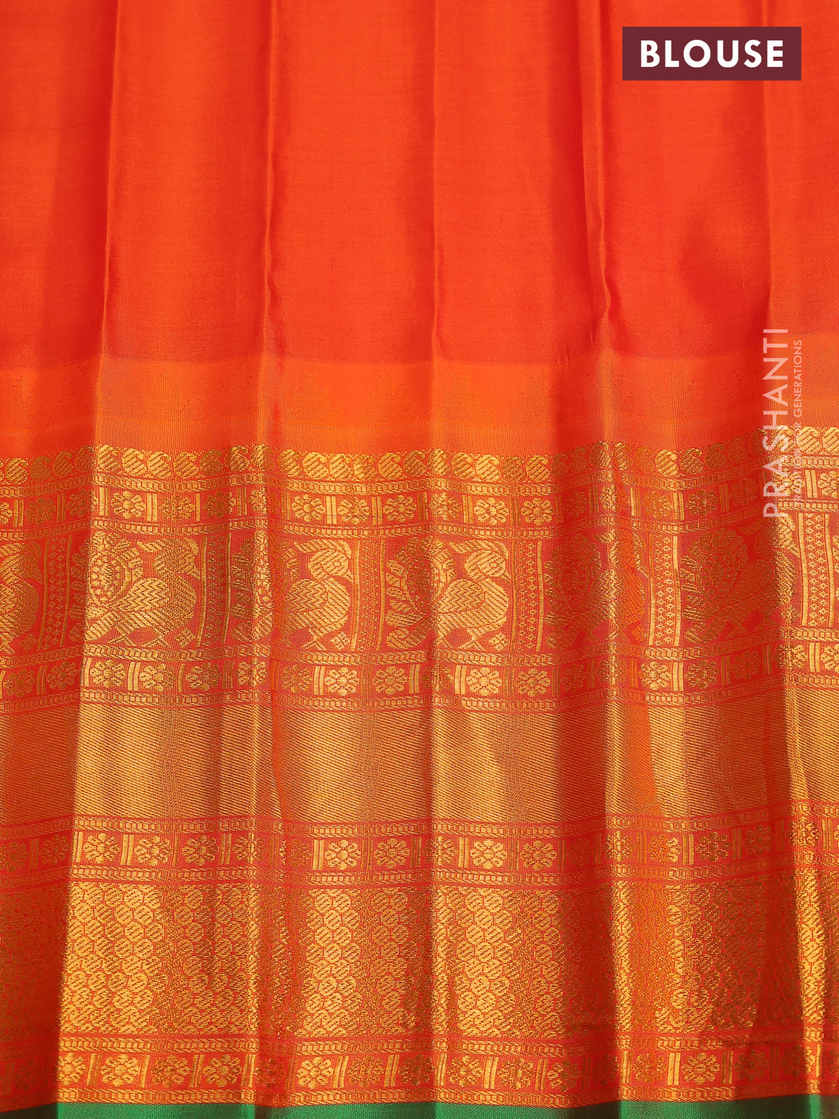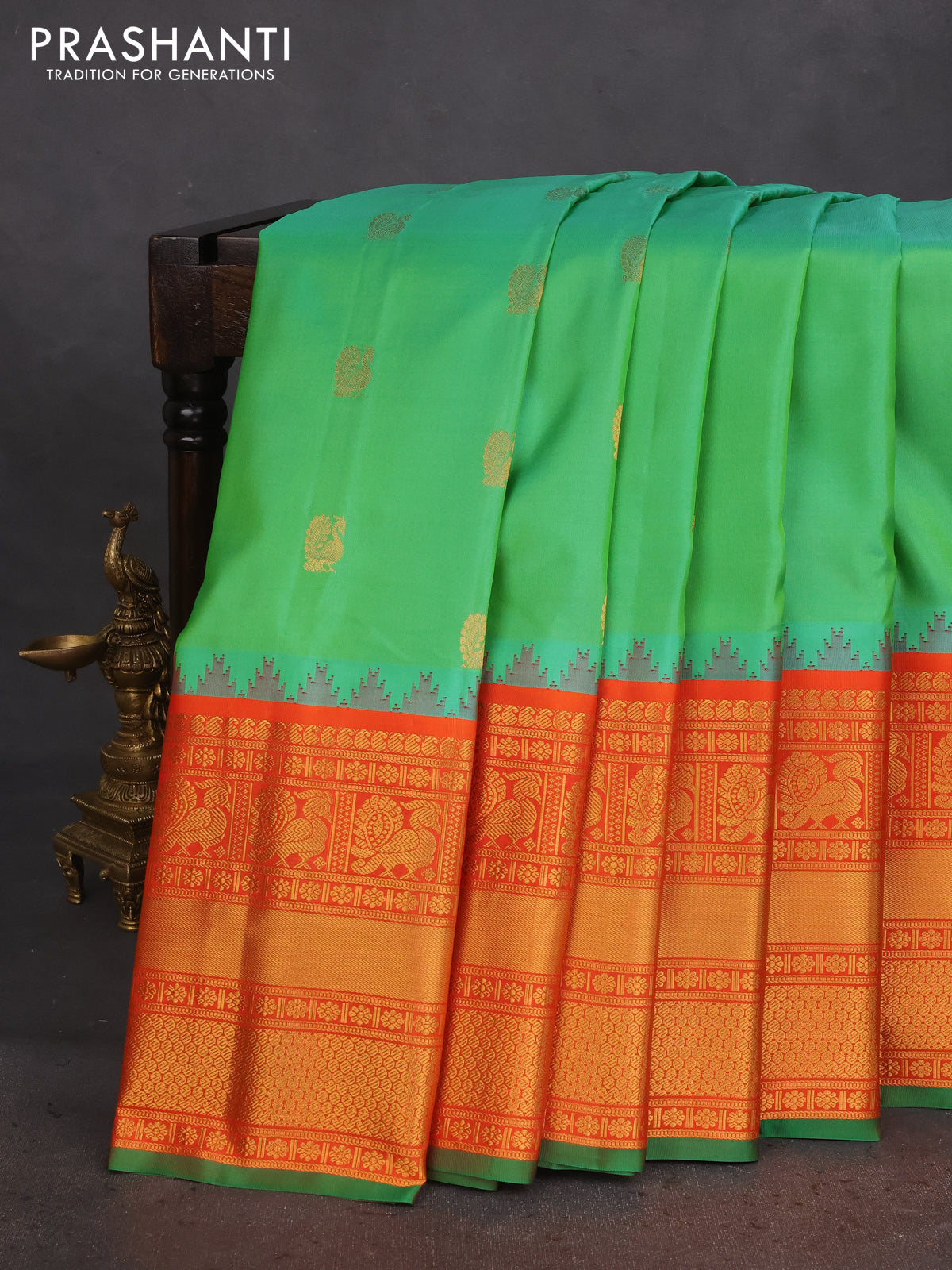 Pure gadwal silk saree light green and orange with annam zari woven buttas and temple design zari woven border