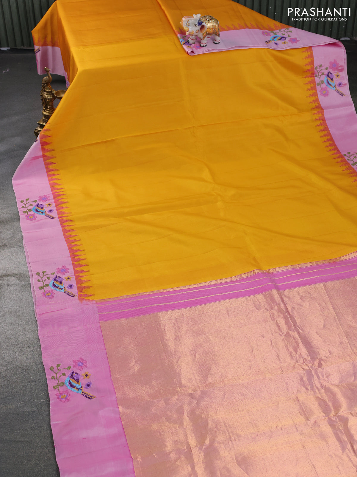 Pure gadwal silk saree mustard yellow and light pink with plain body and embroided butta border
