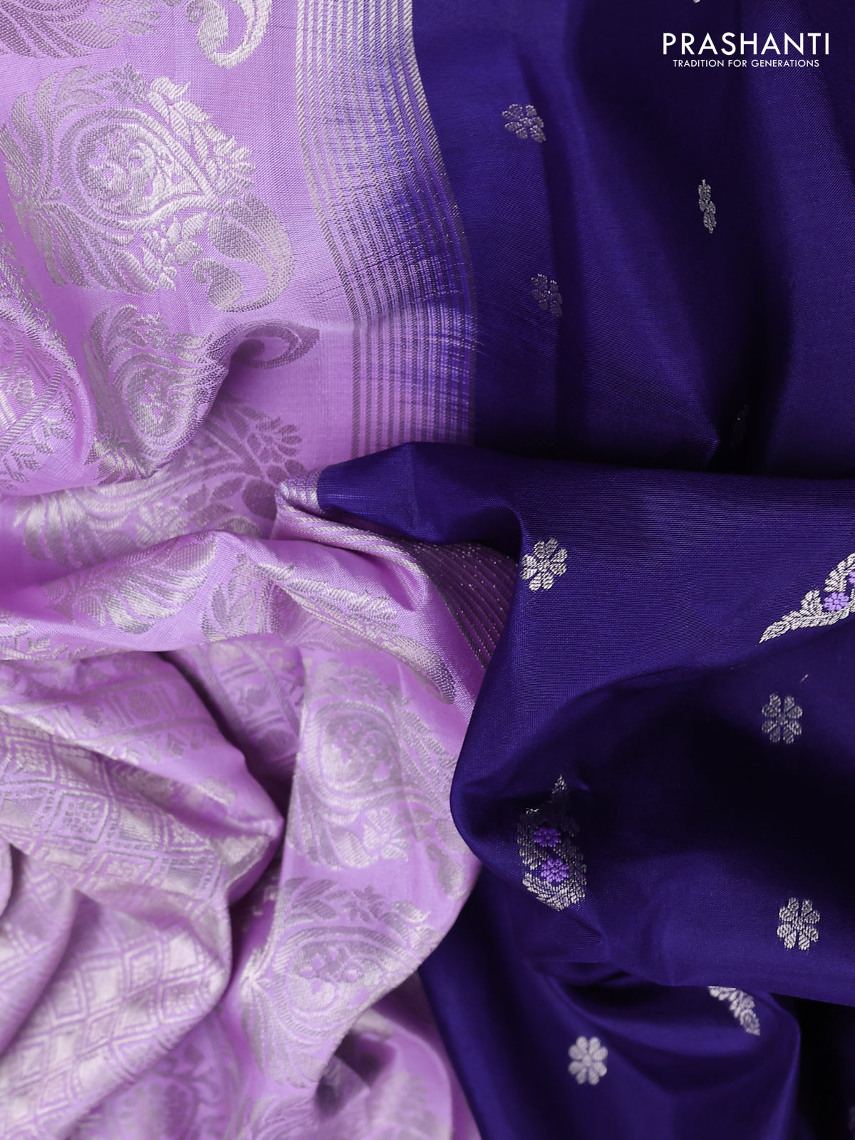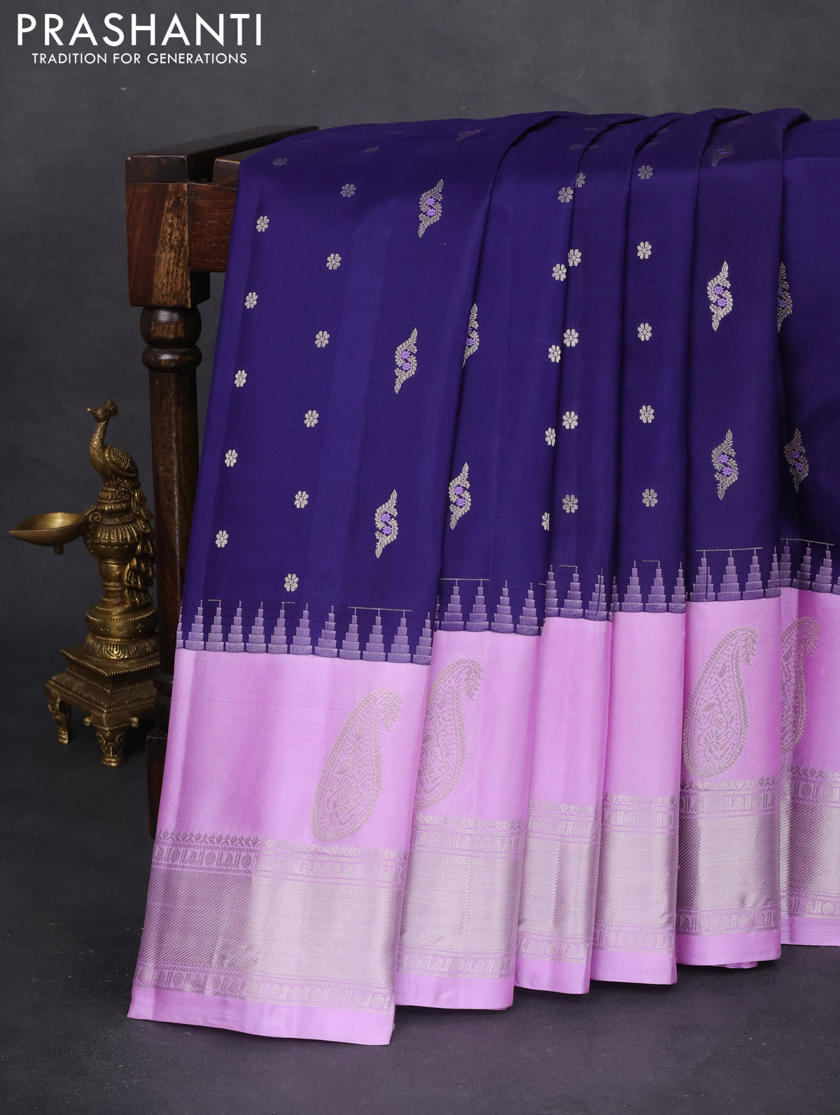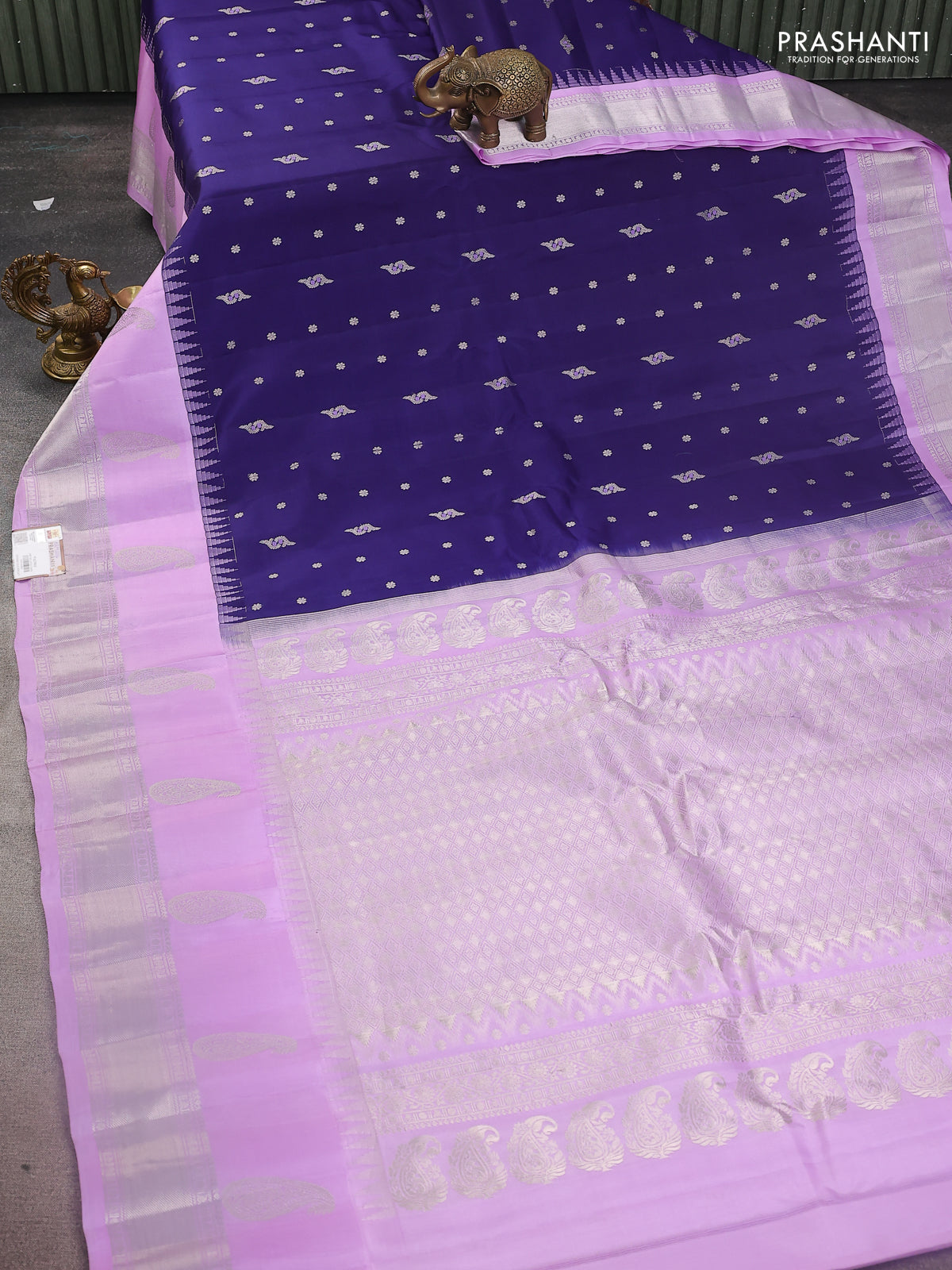 Pure gadwal silk saree navy blue and lavender with allover silver zari woven buttas and long paisley design silver zari woven border