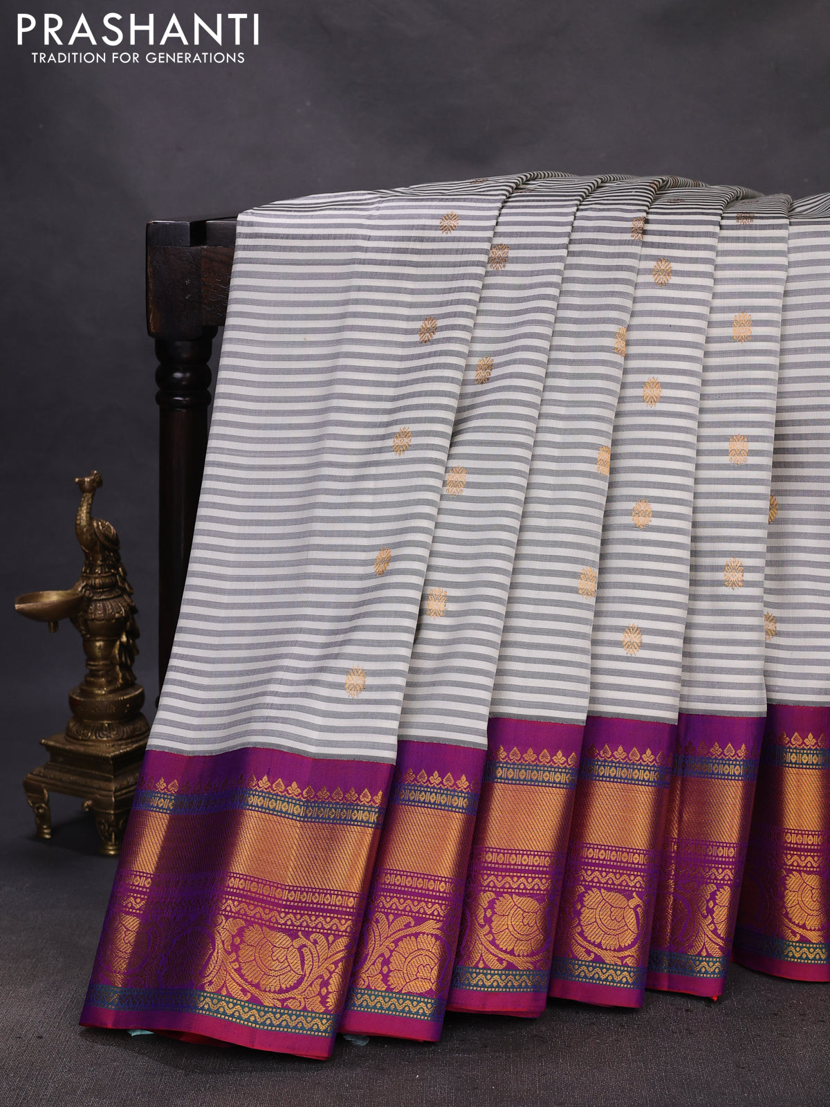 Pure gadwal silk saree off white wine shade and purple with allover stripe pattern & zari buttas and rich zari woven border
