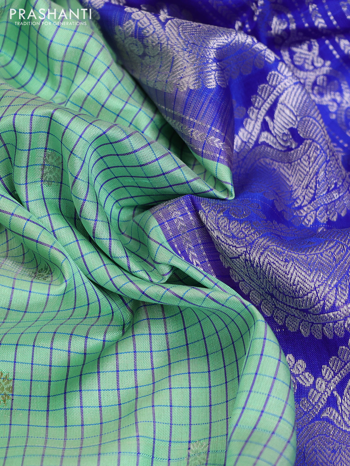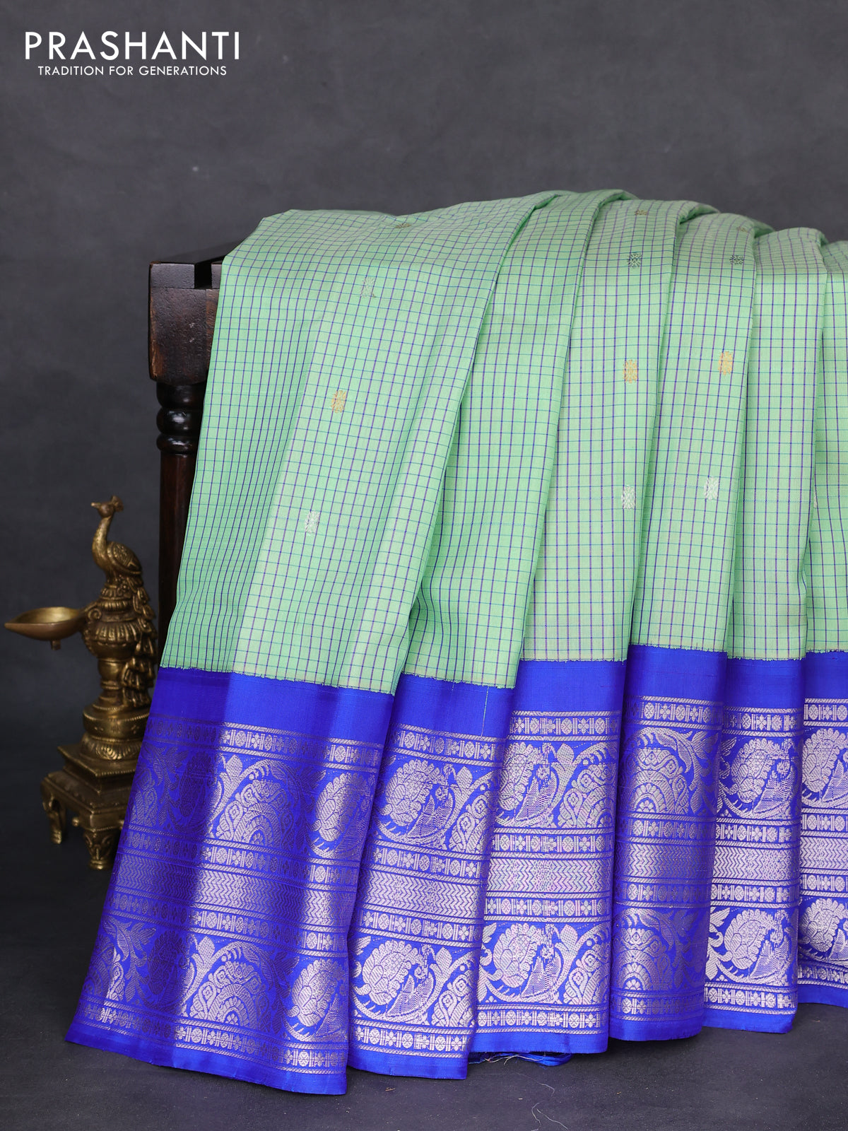 Pure gadwal silk saree pastel green and blue with allover checked pattern & zari buttas and long silver zari woven border