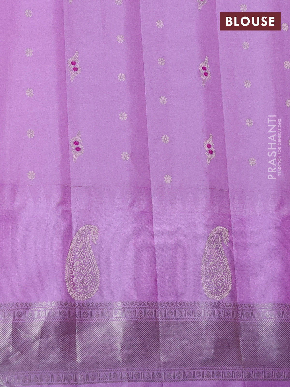 Pure gadwal silk saree peach shade and lavender with silver zari woven buttas and long temple design paisley silver zari woven border