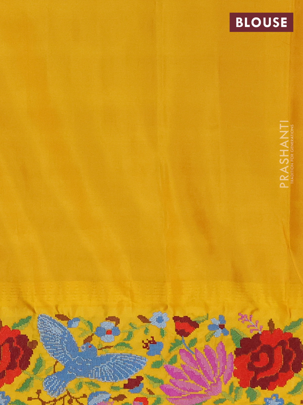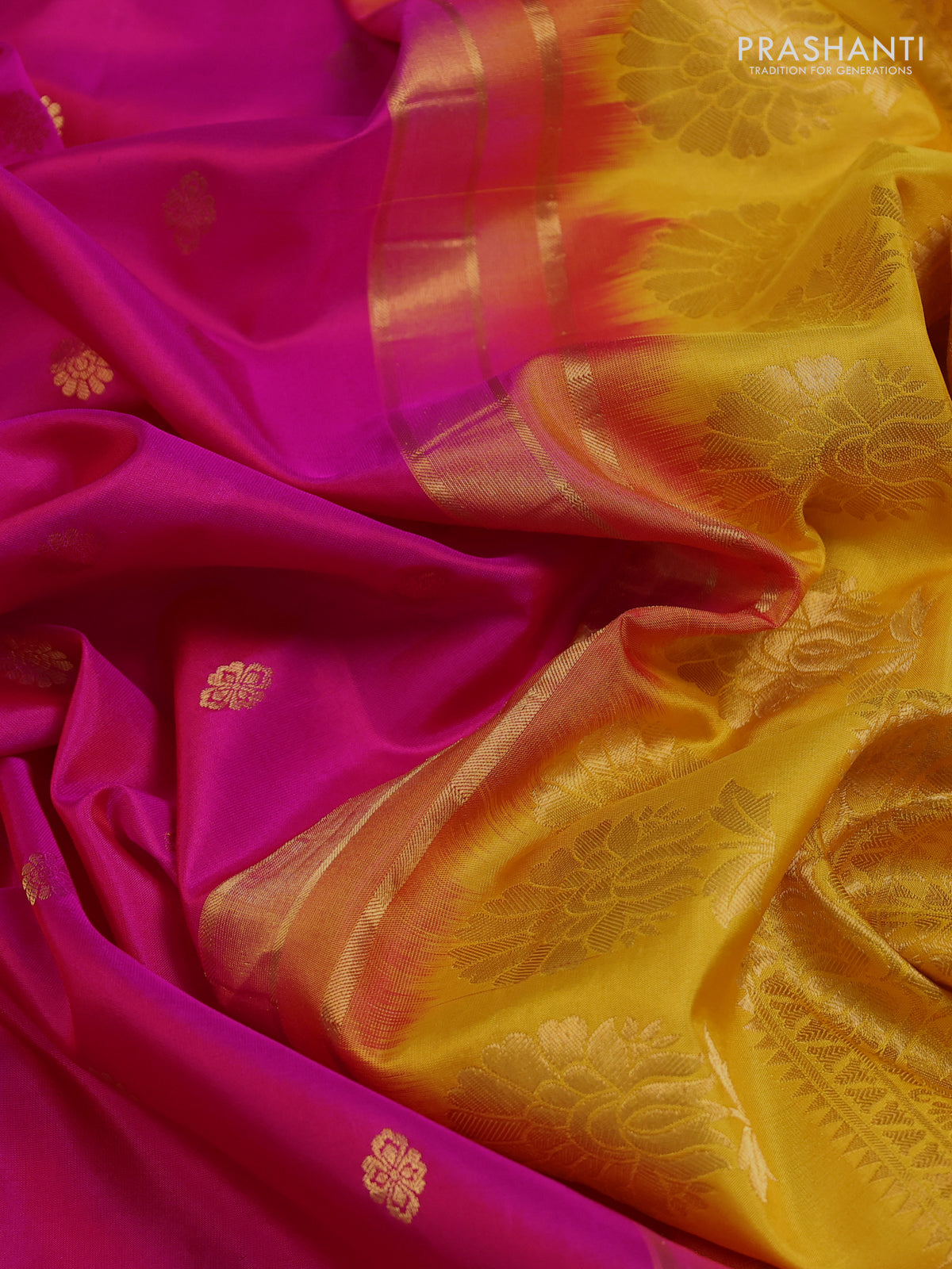 Pure gadwal silk saree pink and mango yellow with zari woven buttas and temple design convent embroidery border
