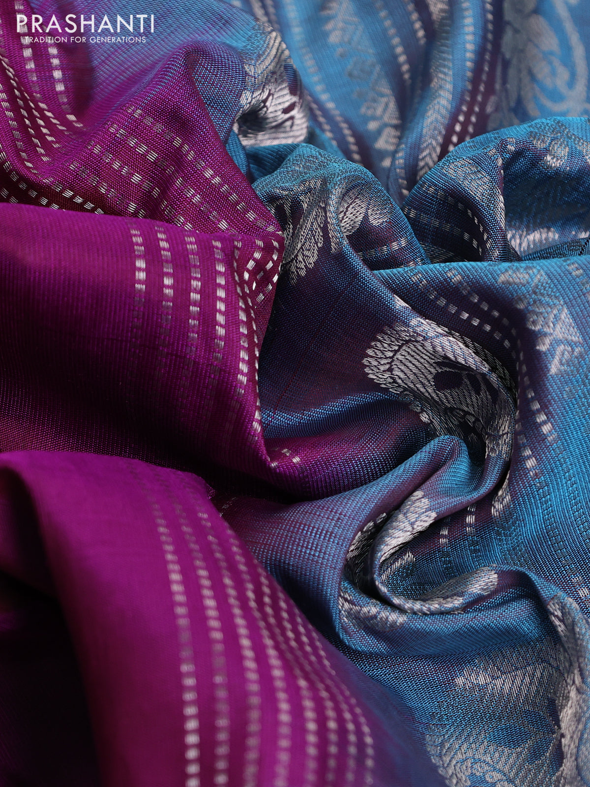 Pure gadwal silk saree purple and pastel blue with silver & gold zari woven floral buttas and rettapet silver zari woven border