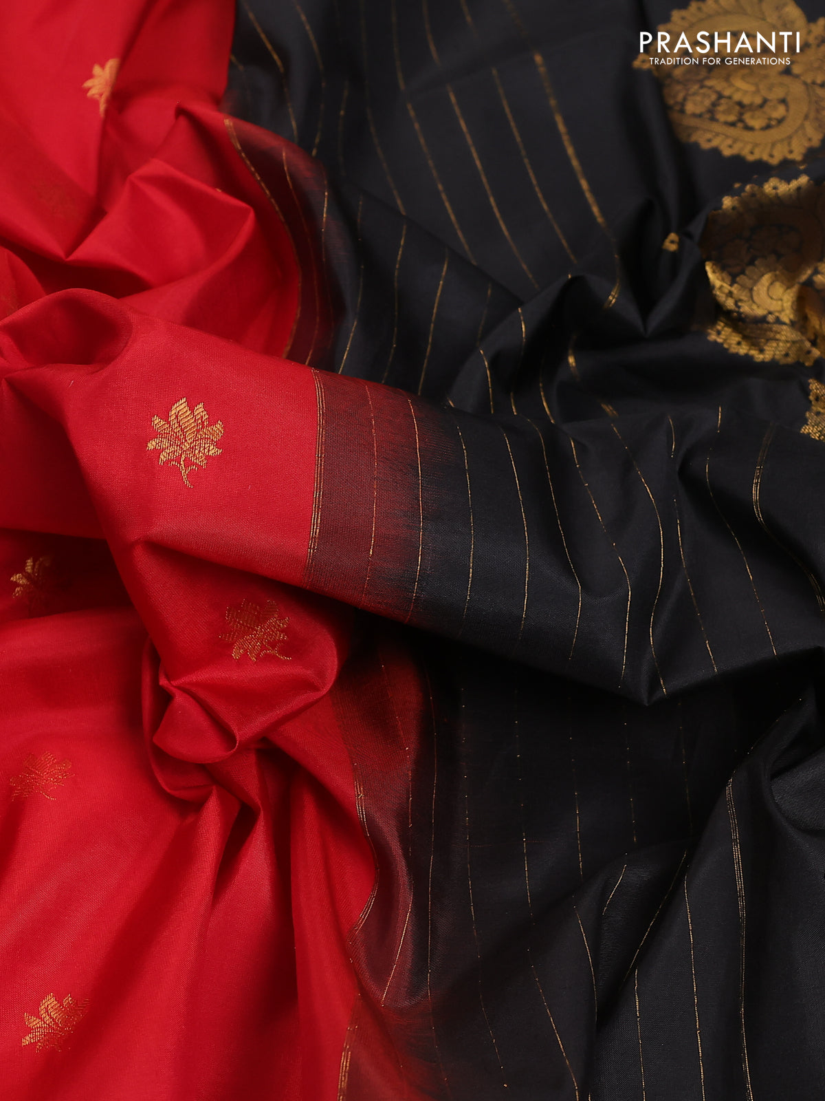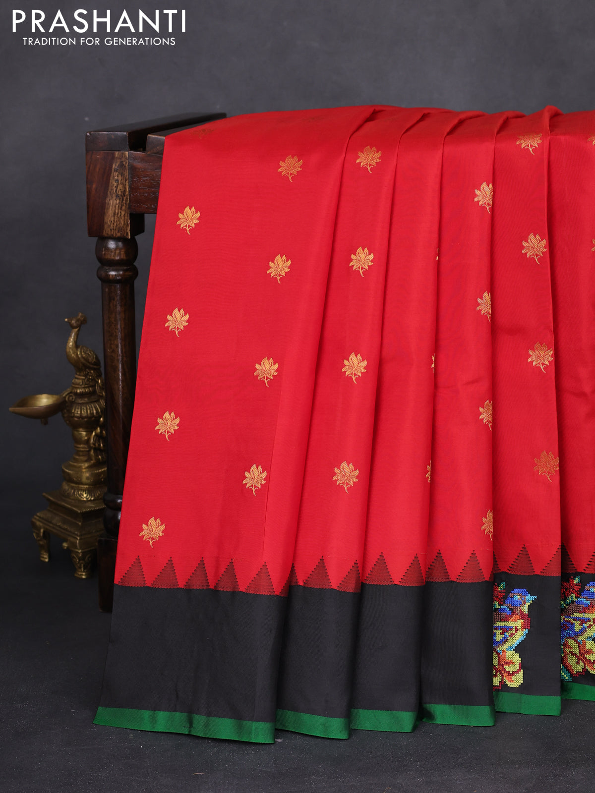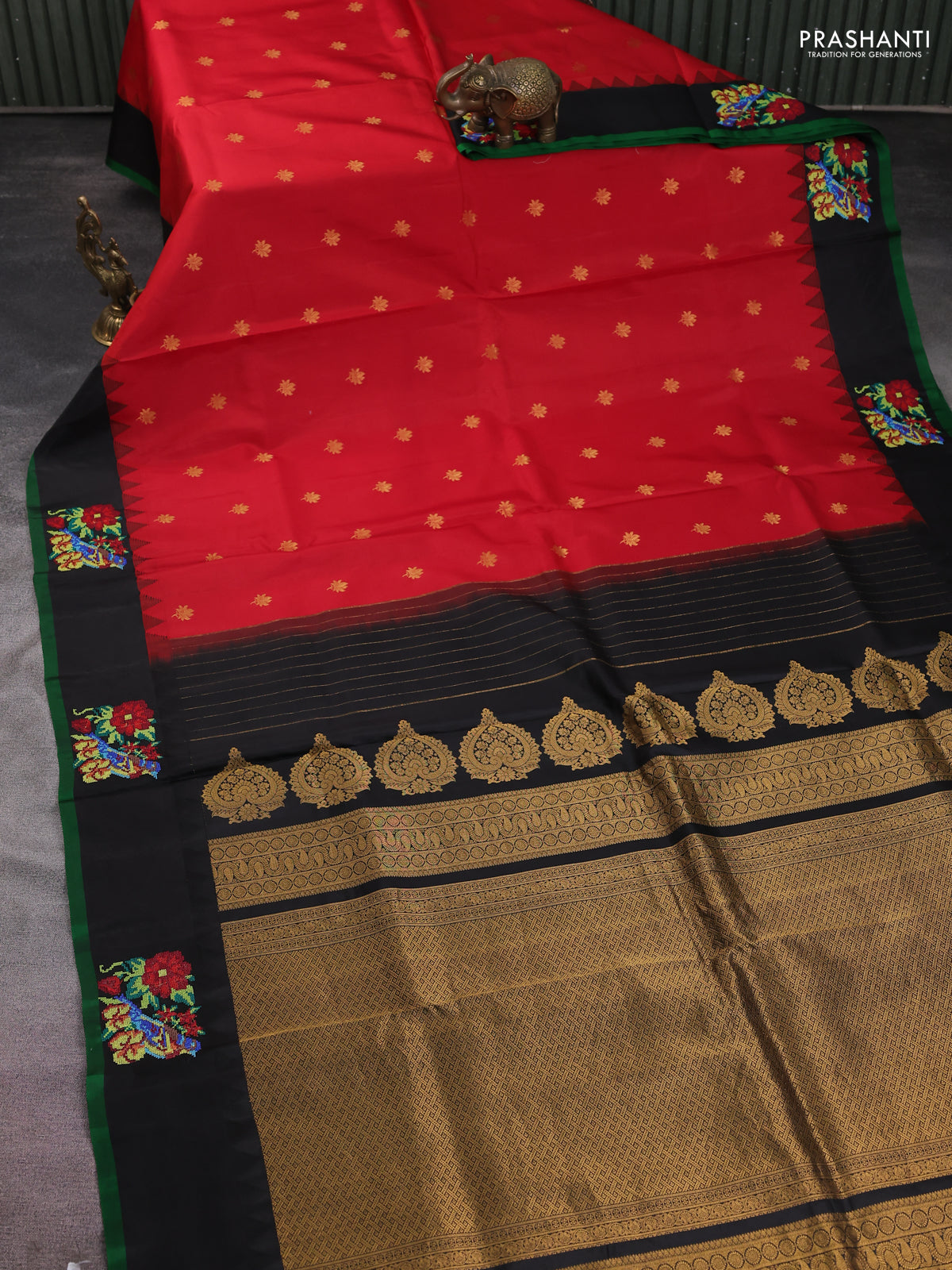 Pure gadwal silk saree red and black with zari woven buttas and temple design embroidery border