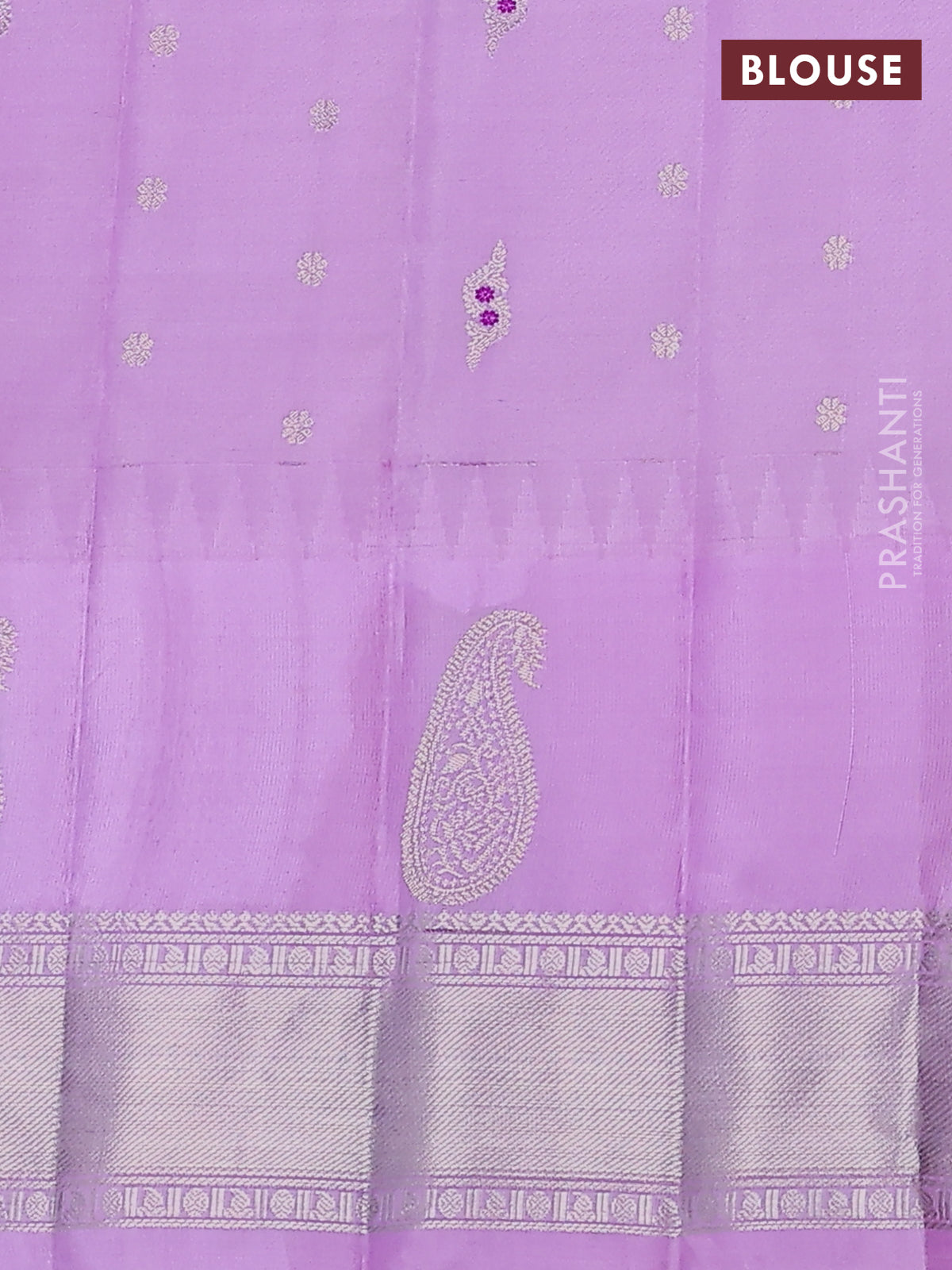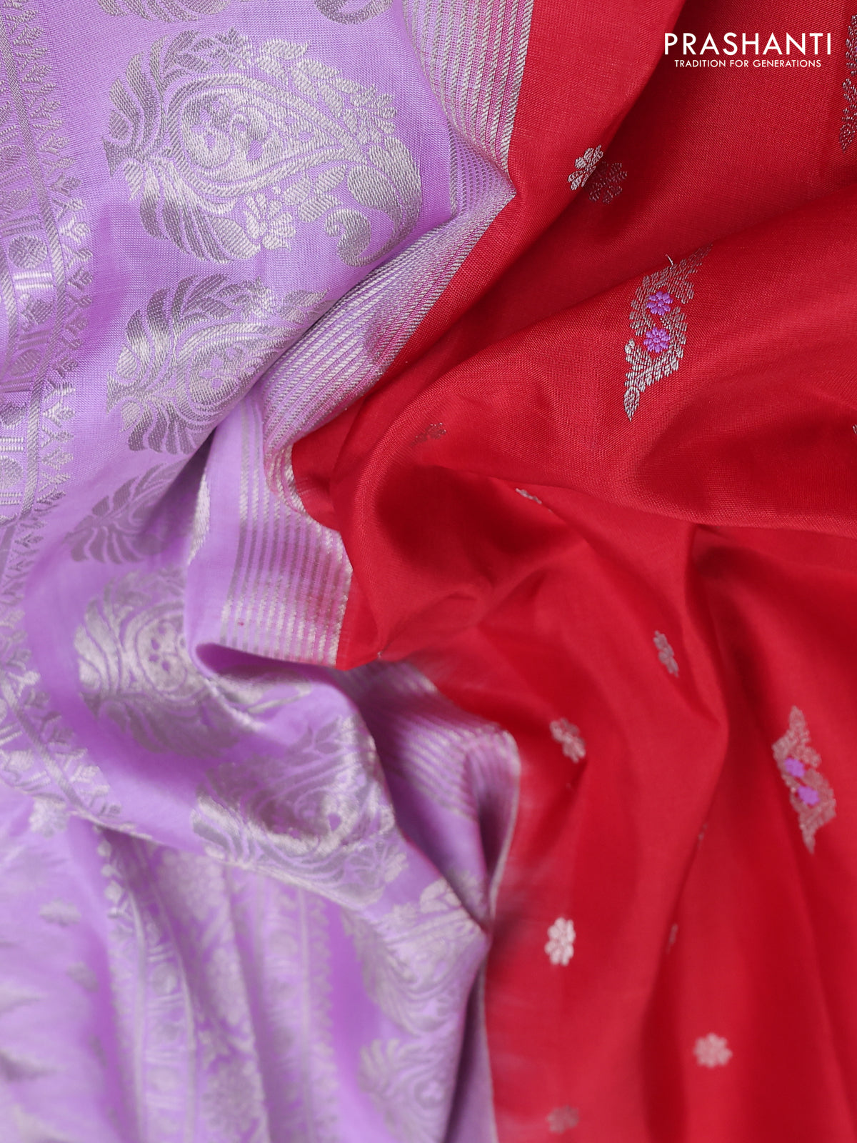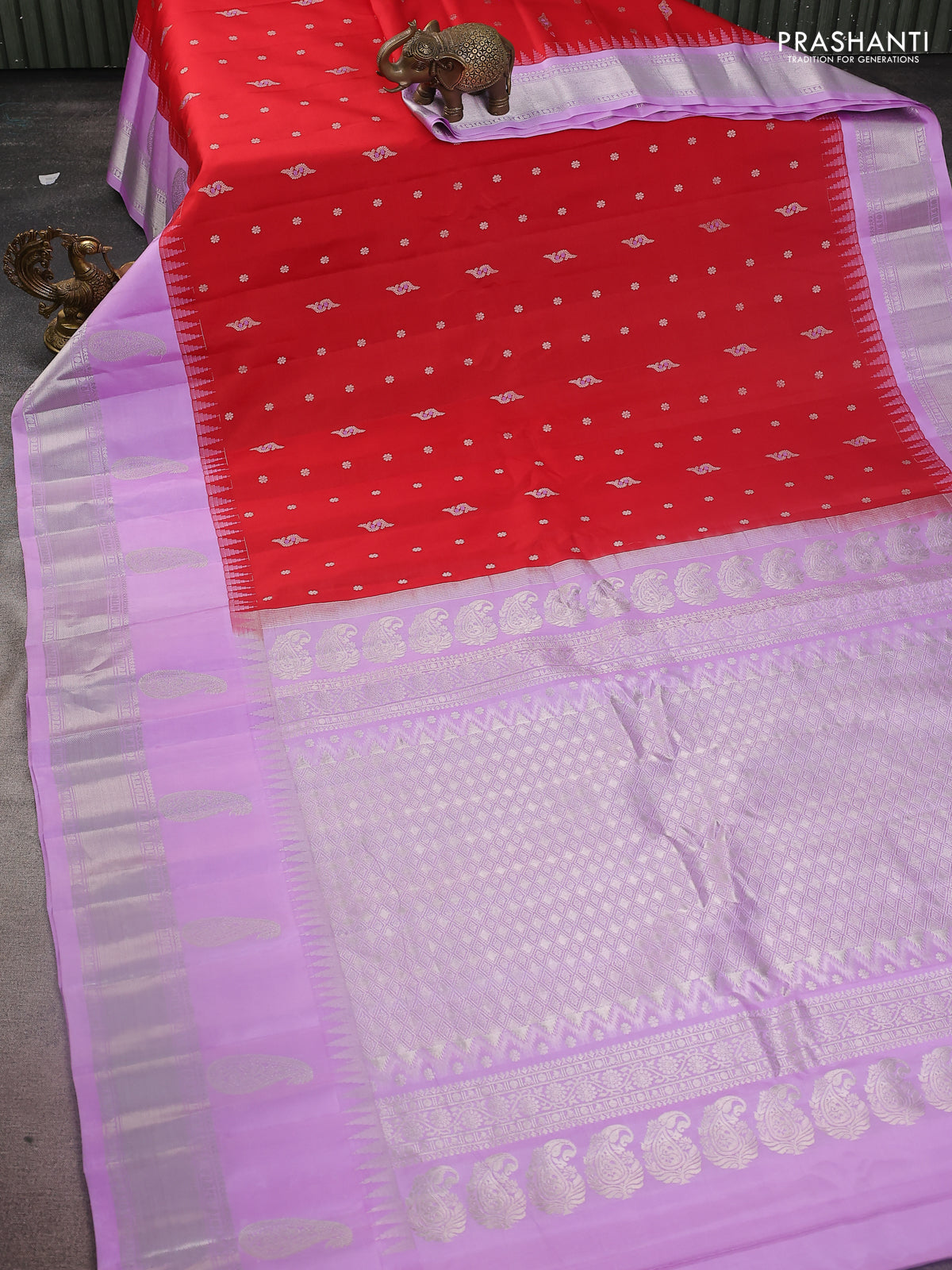 Pure gadwal silk saree red and lavender with allover silver zari woven buttas and long paisley design silver zari woven border