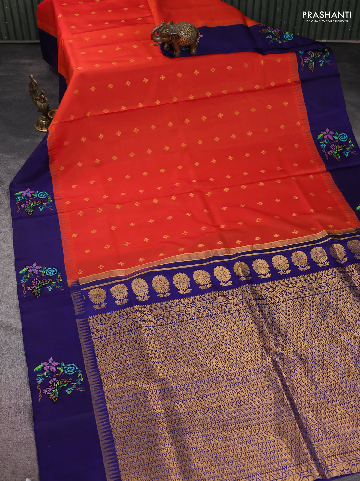 Pure gadwal silk saree sunset orange and blue with zari woven buttas and temple design embroidery border