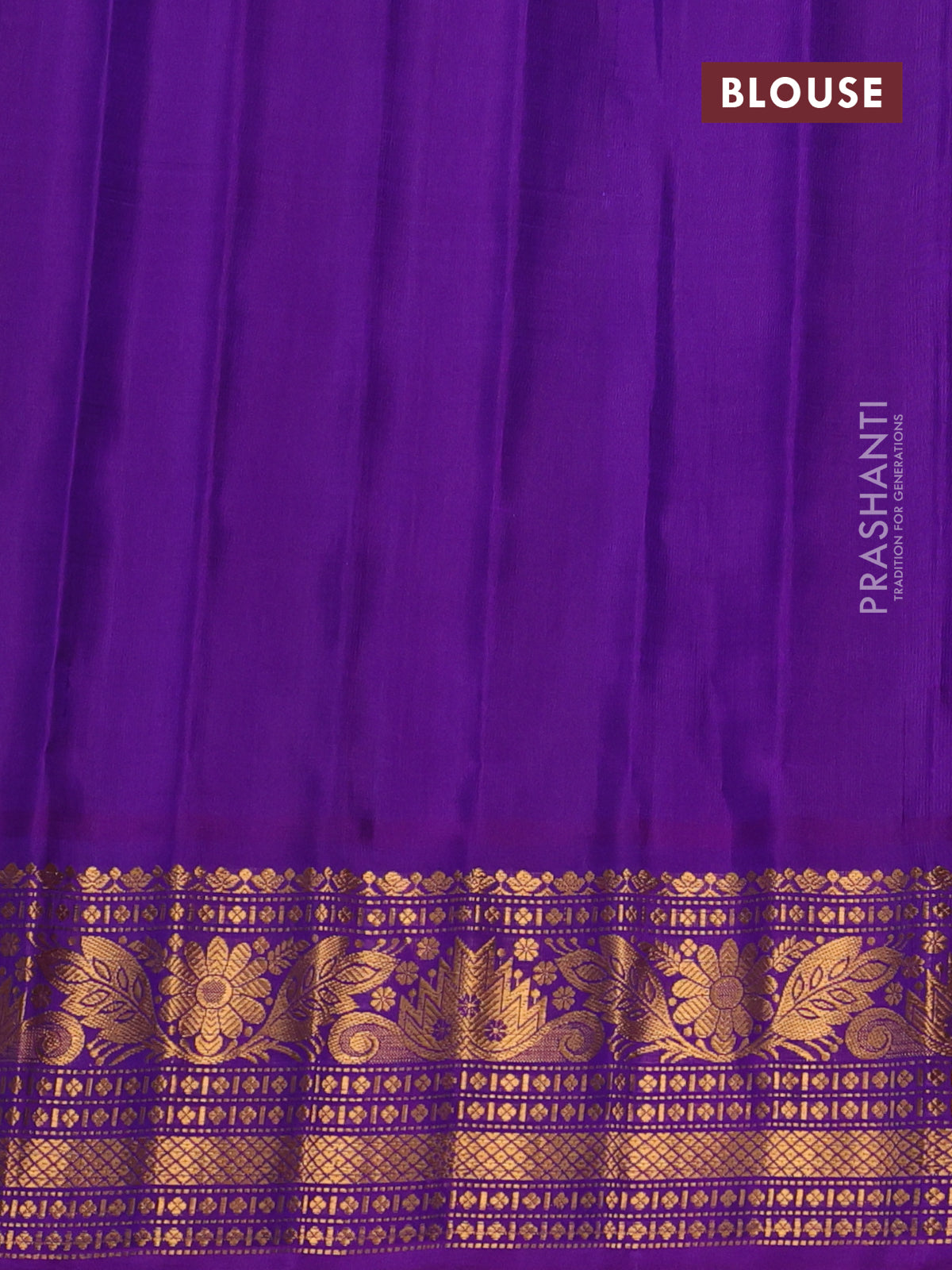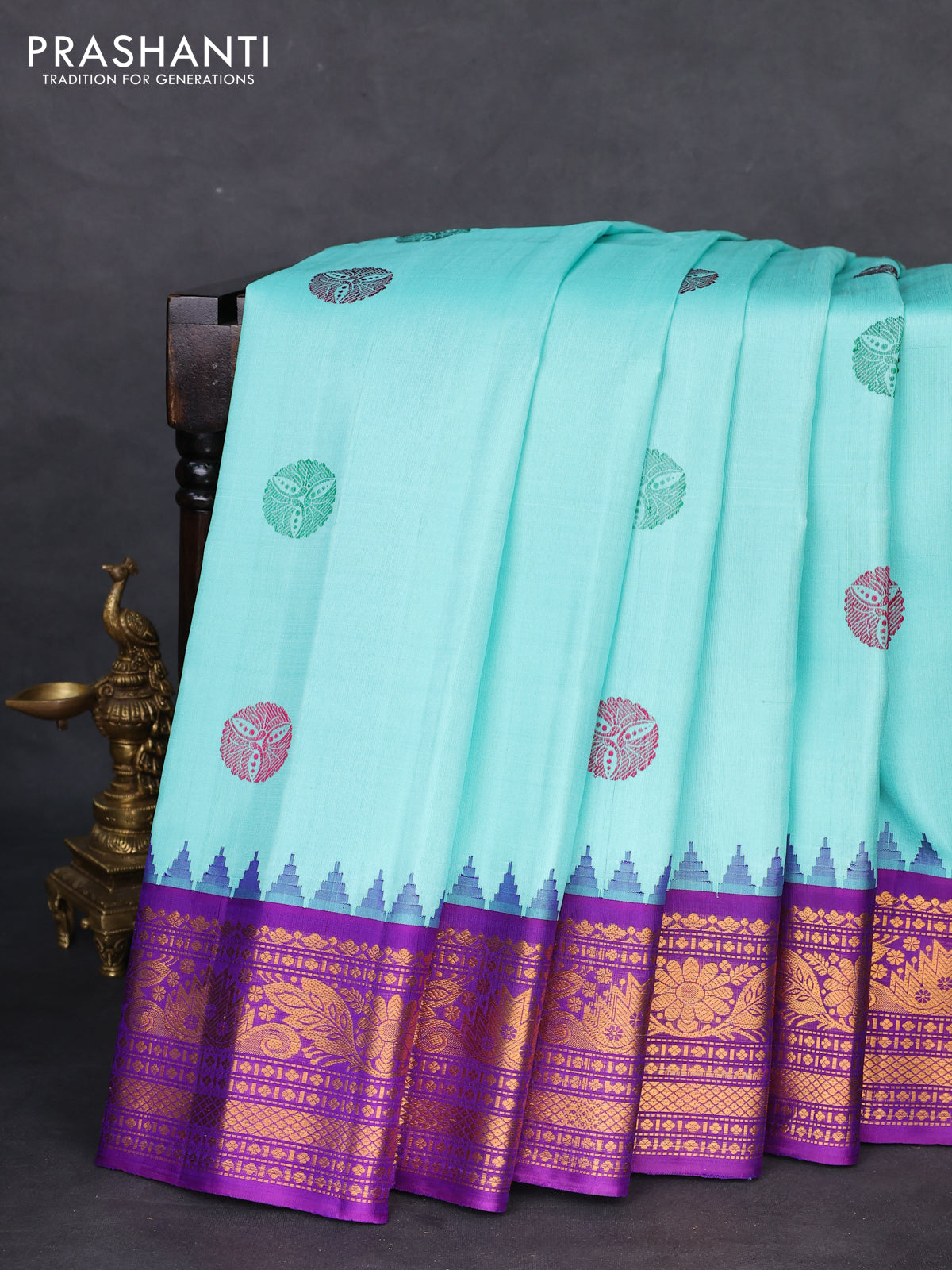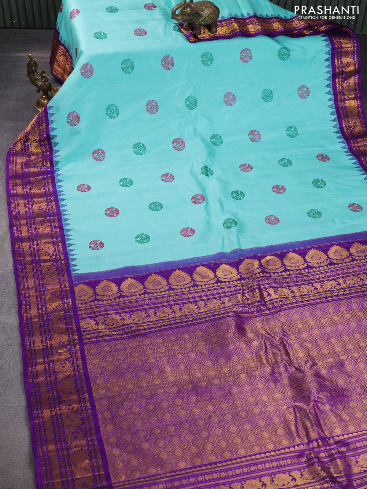 Pure gadwal silk saree teal blue and violet with thread woven buttas and temple design zari woven border