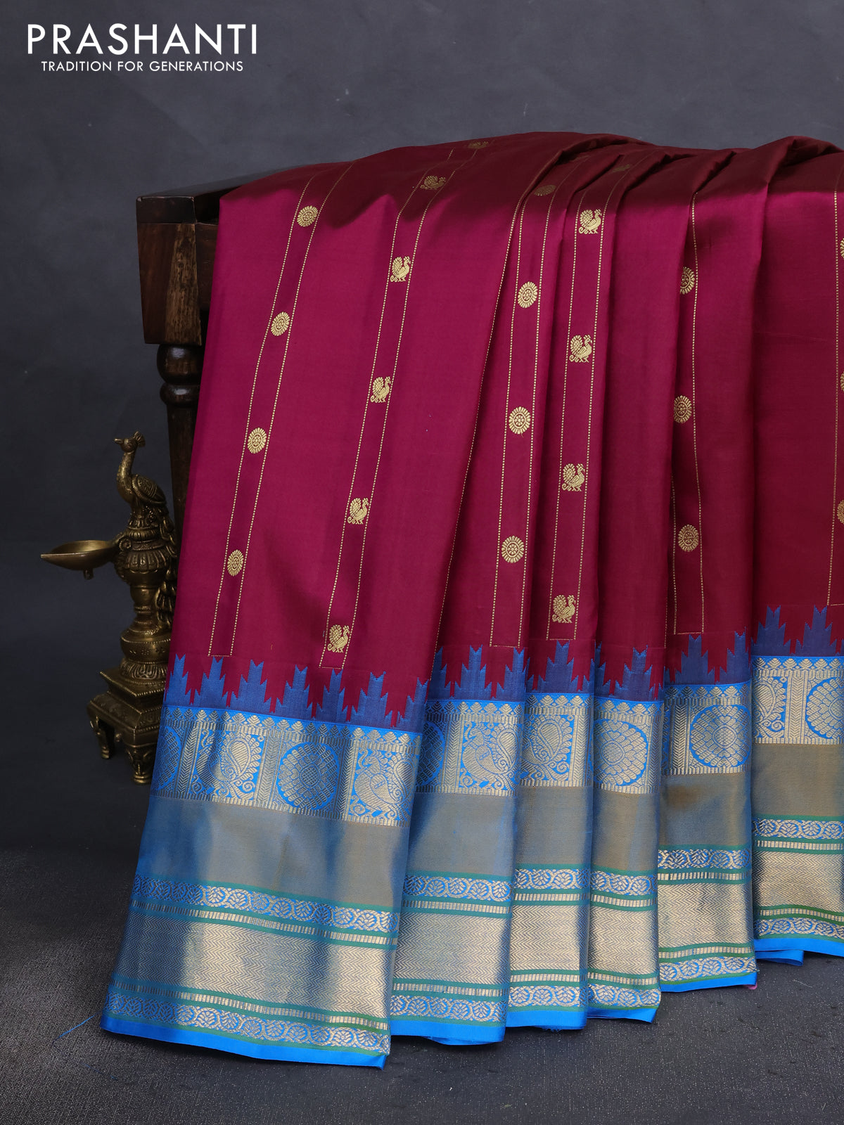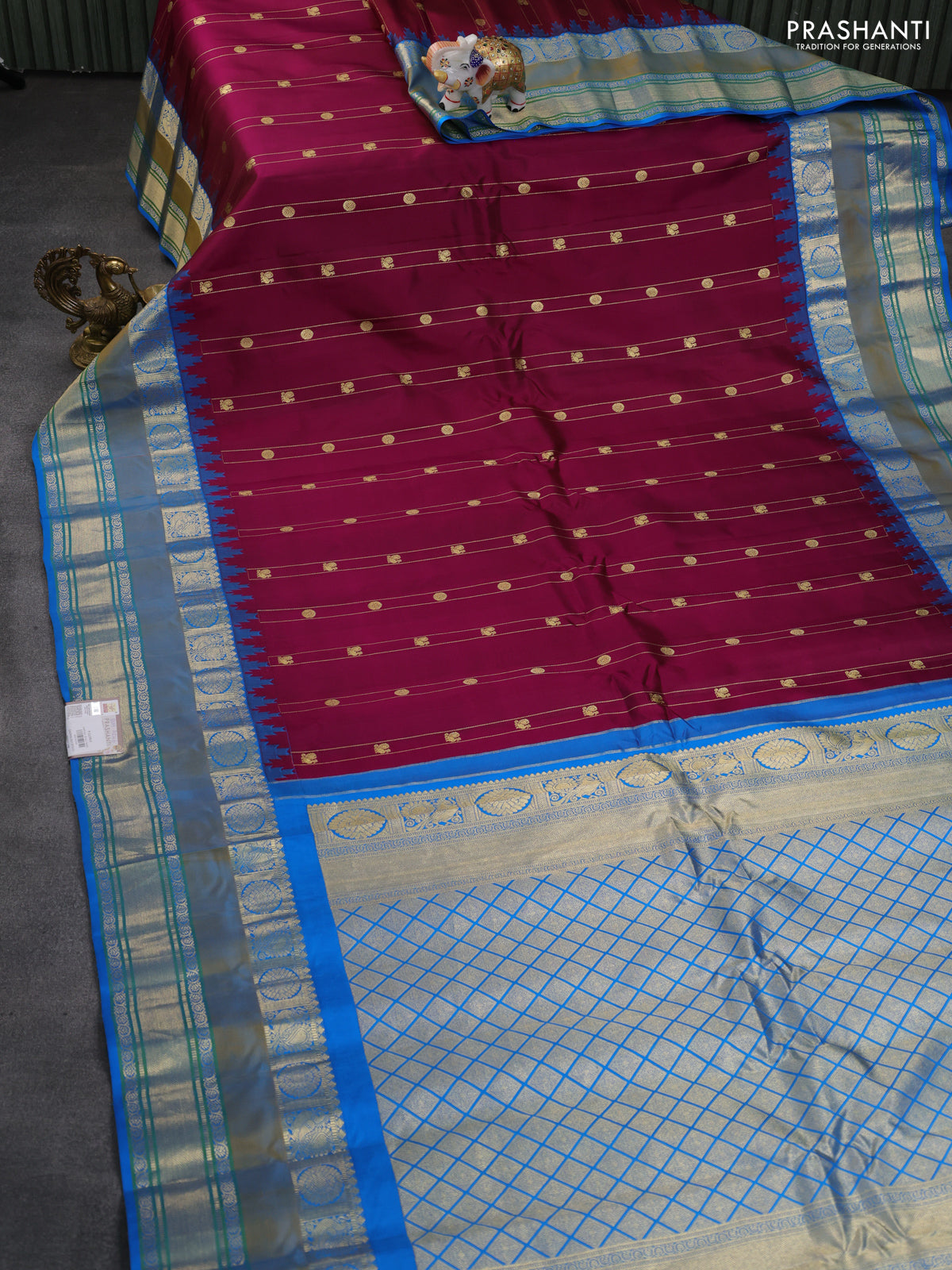 Pure gadwal silk saree wine shade and cs blue with allover zari weaves & buttas and temple design rettapet zari woven border