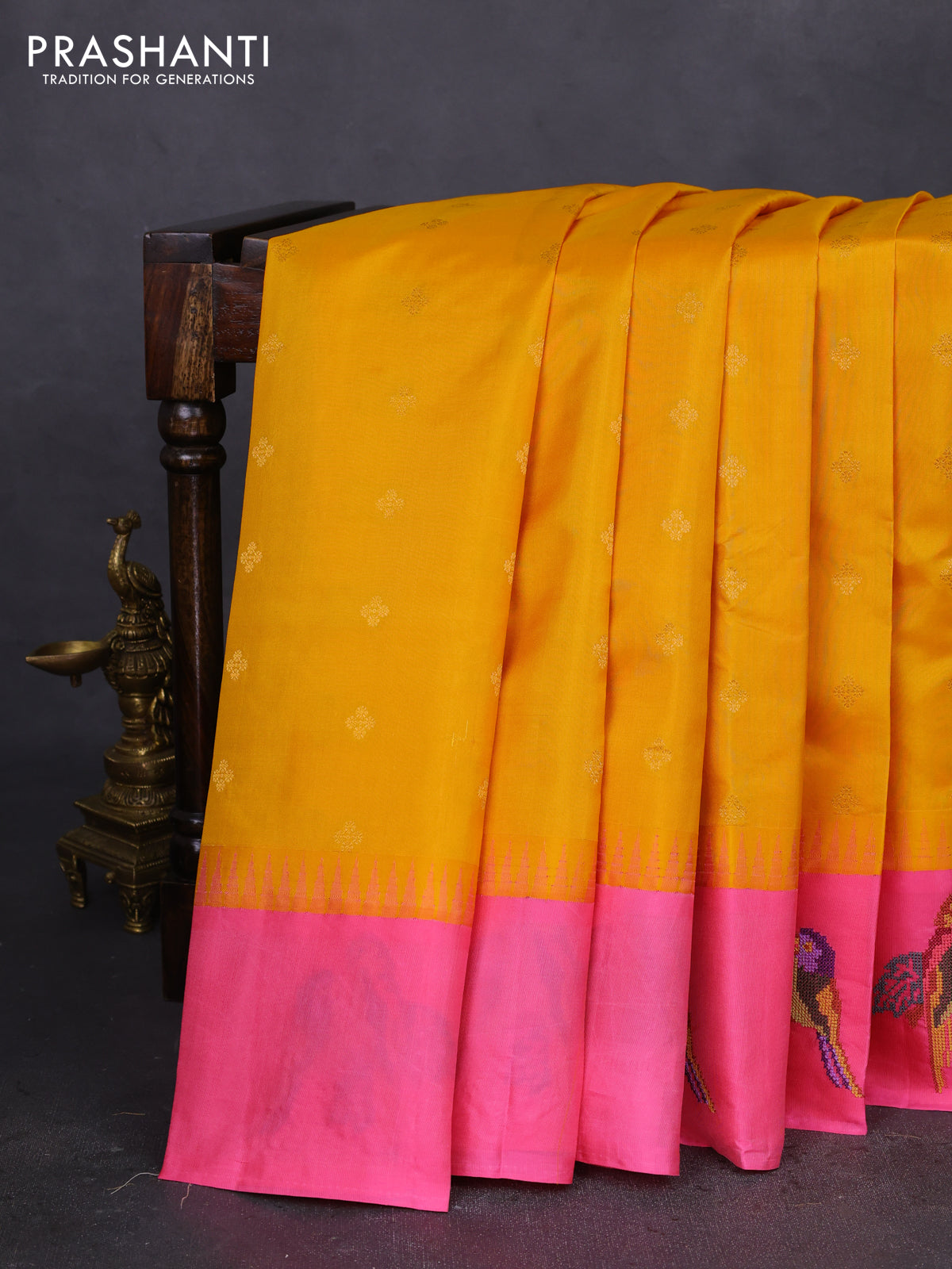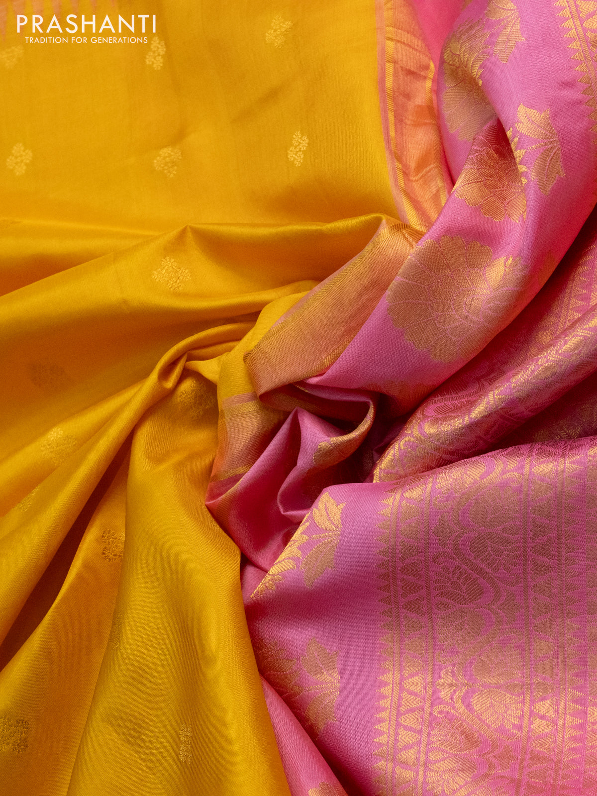 Pure gadwal silk saree yellow and pink with zari woven buttas and embroided butta border