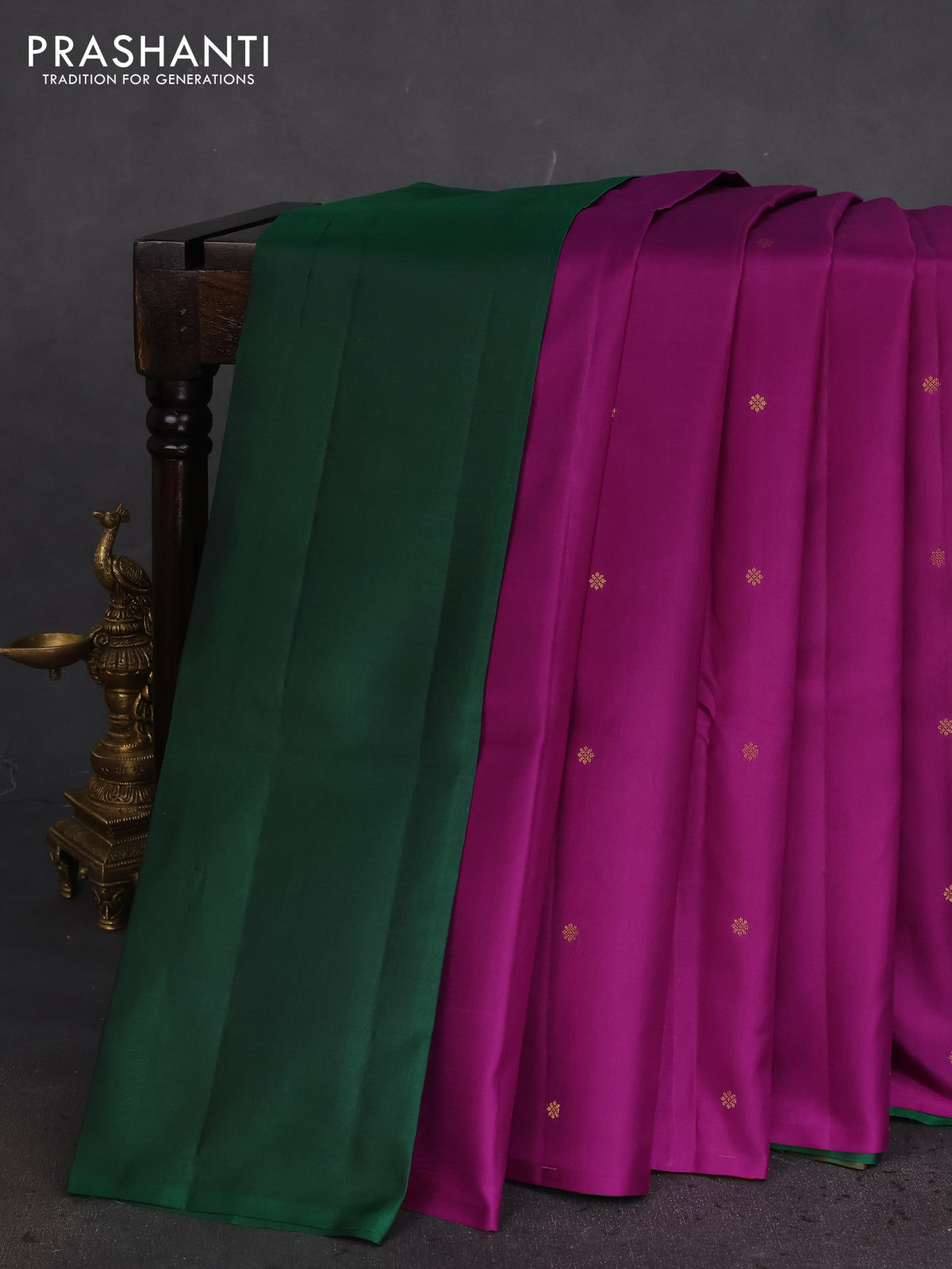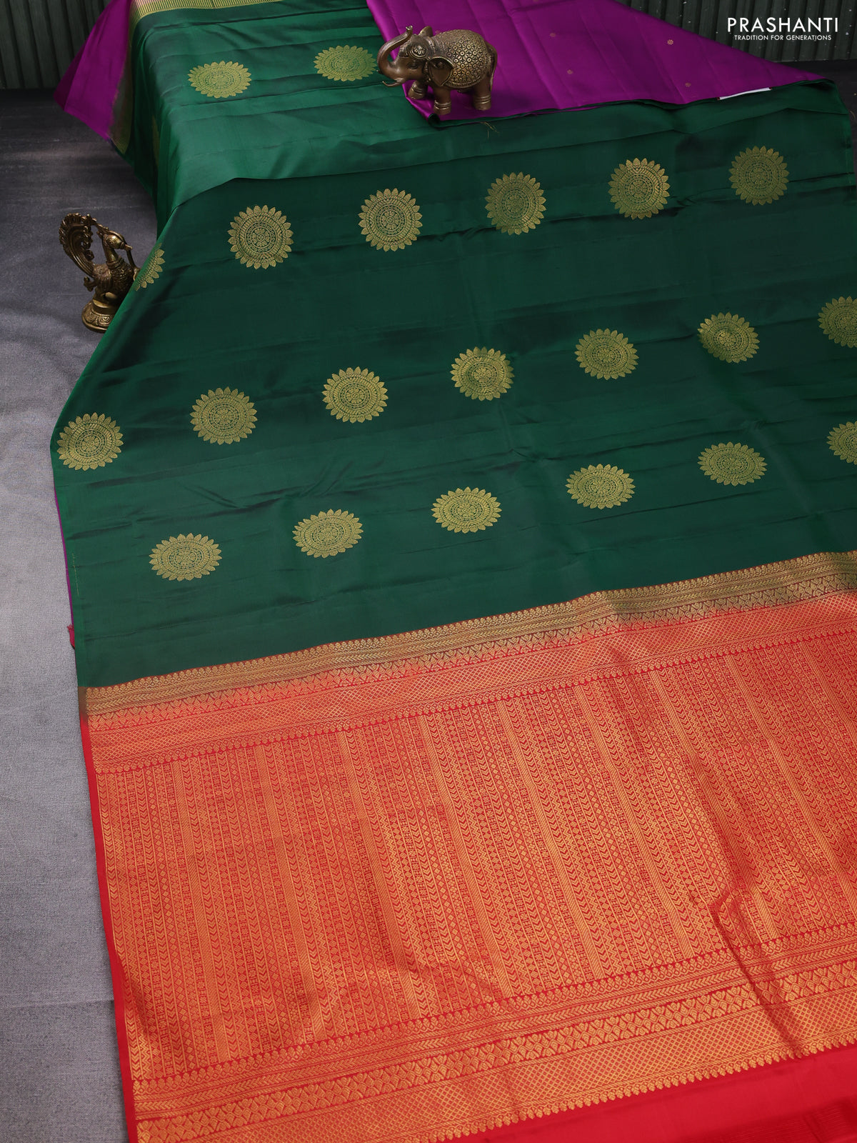 Pure kanchipuram partly silk saree gree and red purple with zari woven buttas in borderless style