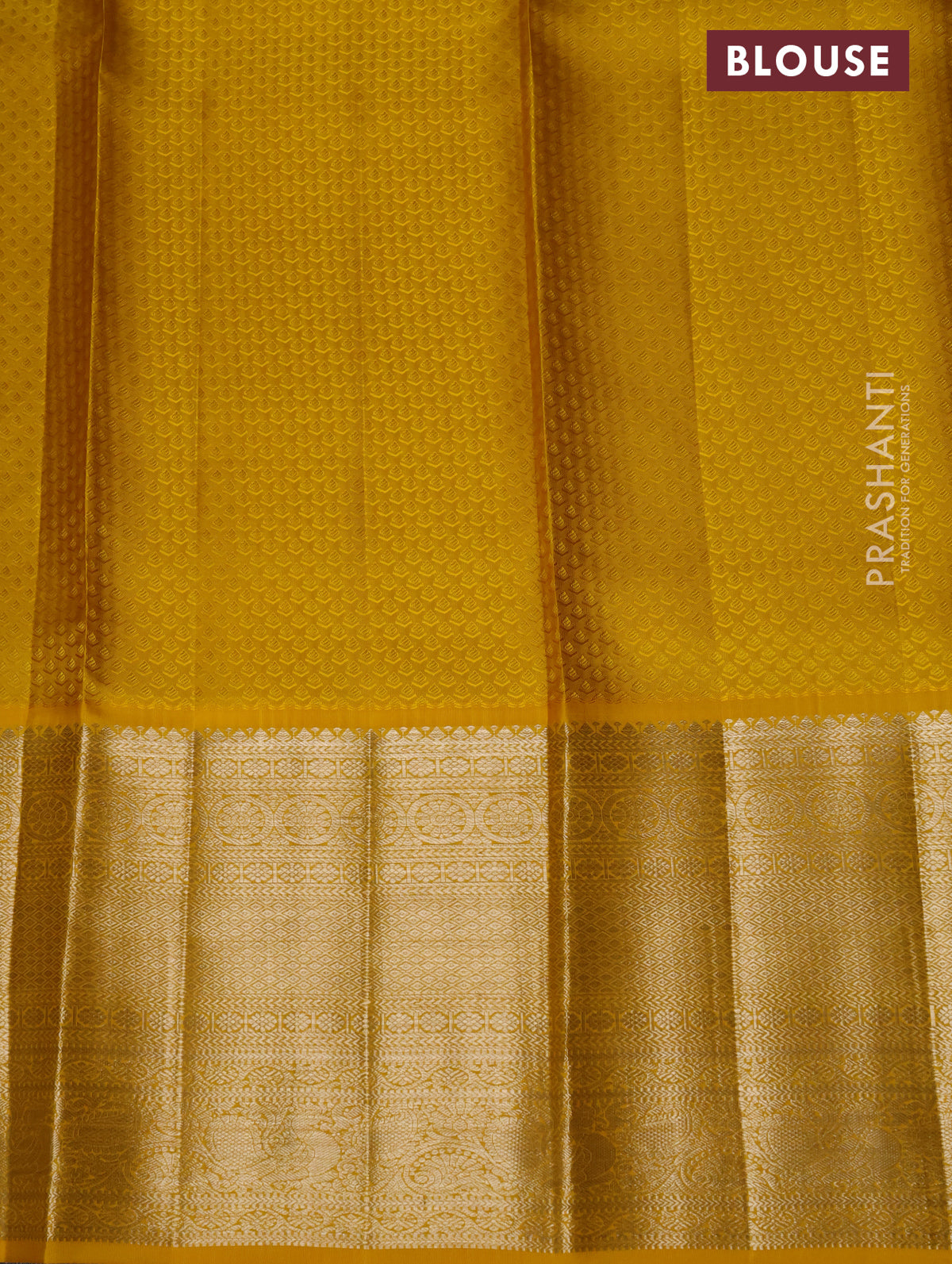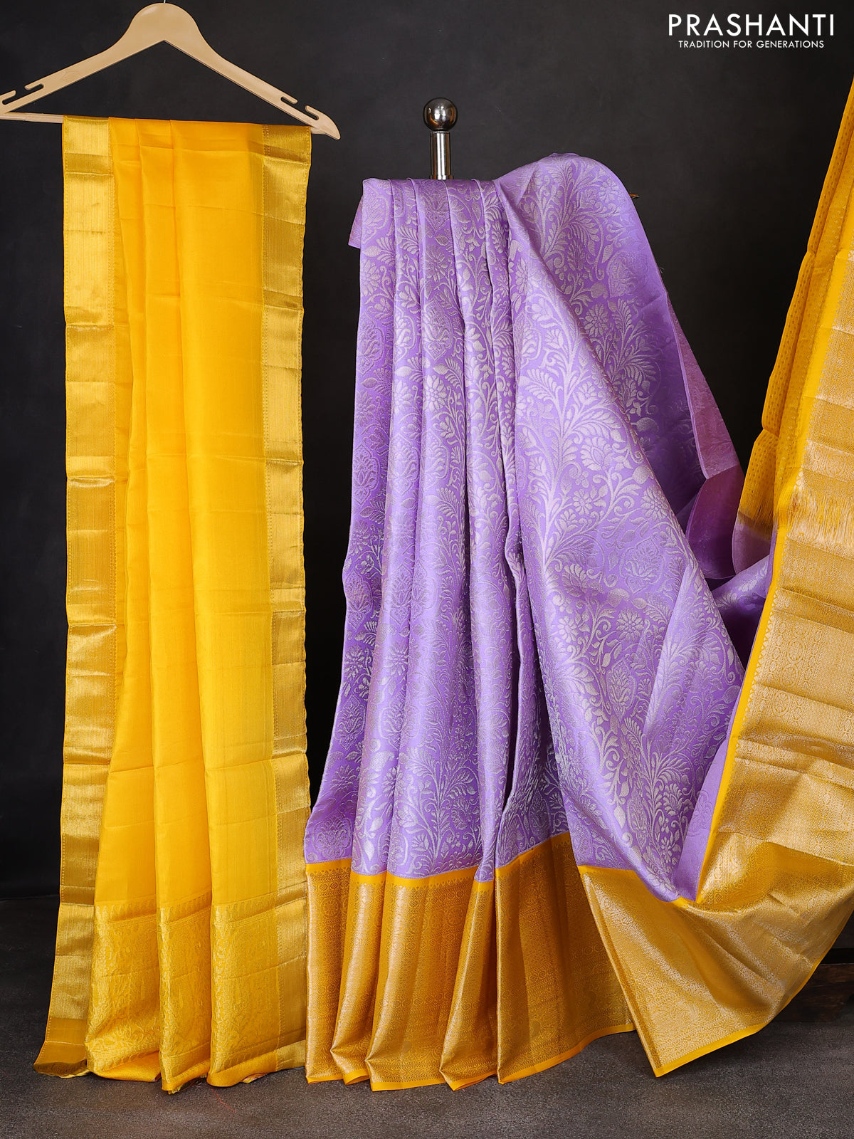 Pure kanchipuram silk lehenga lavender and yellow with allover silver zari woven broacde weaves and long zari woven border