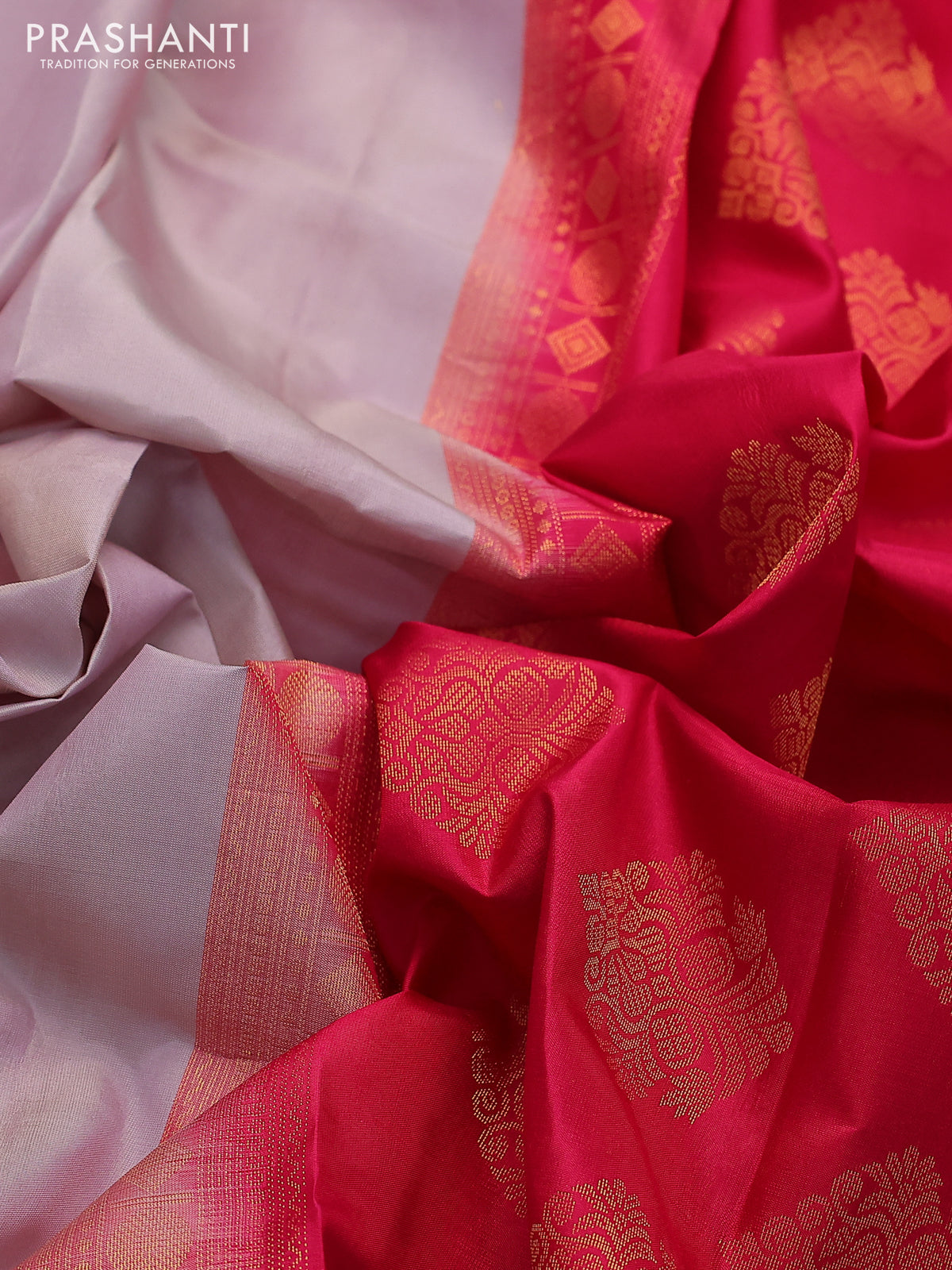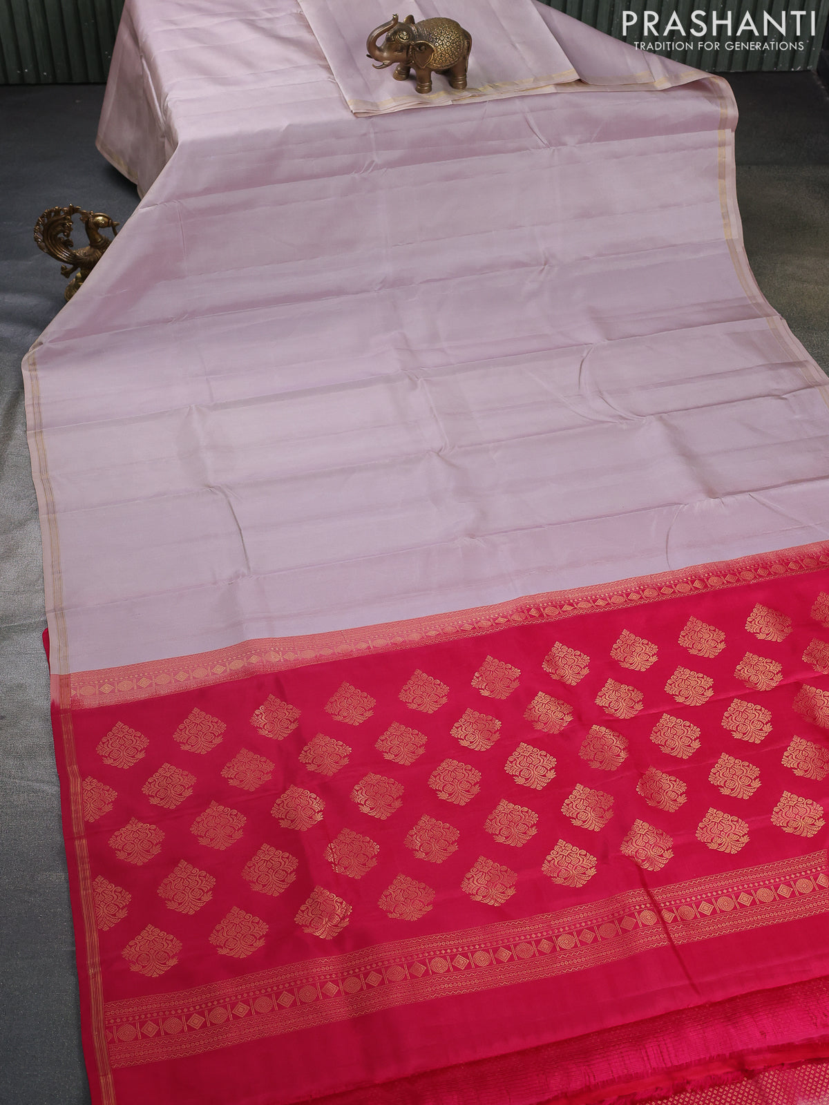 Pure kanchipuram silk saree beige and pink with plain body and small zari woven border