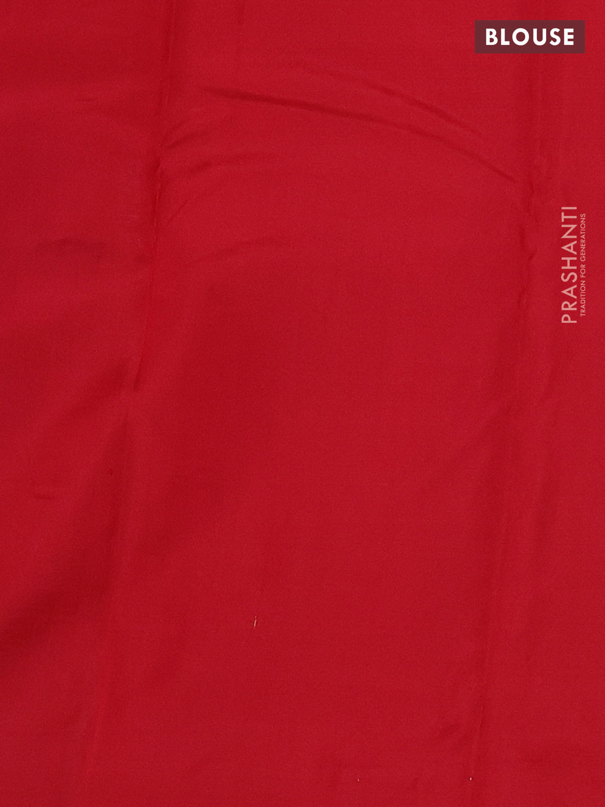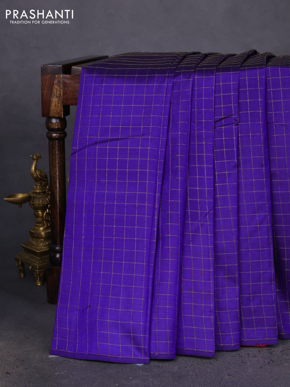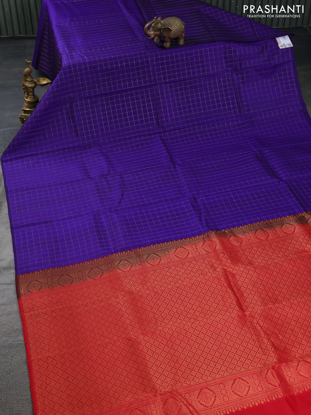 Pure kanchipuram silk saree blue and red with allover zari checked pattern in borderless style