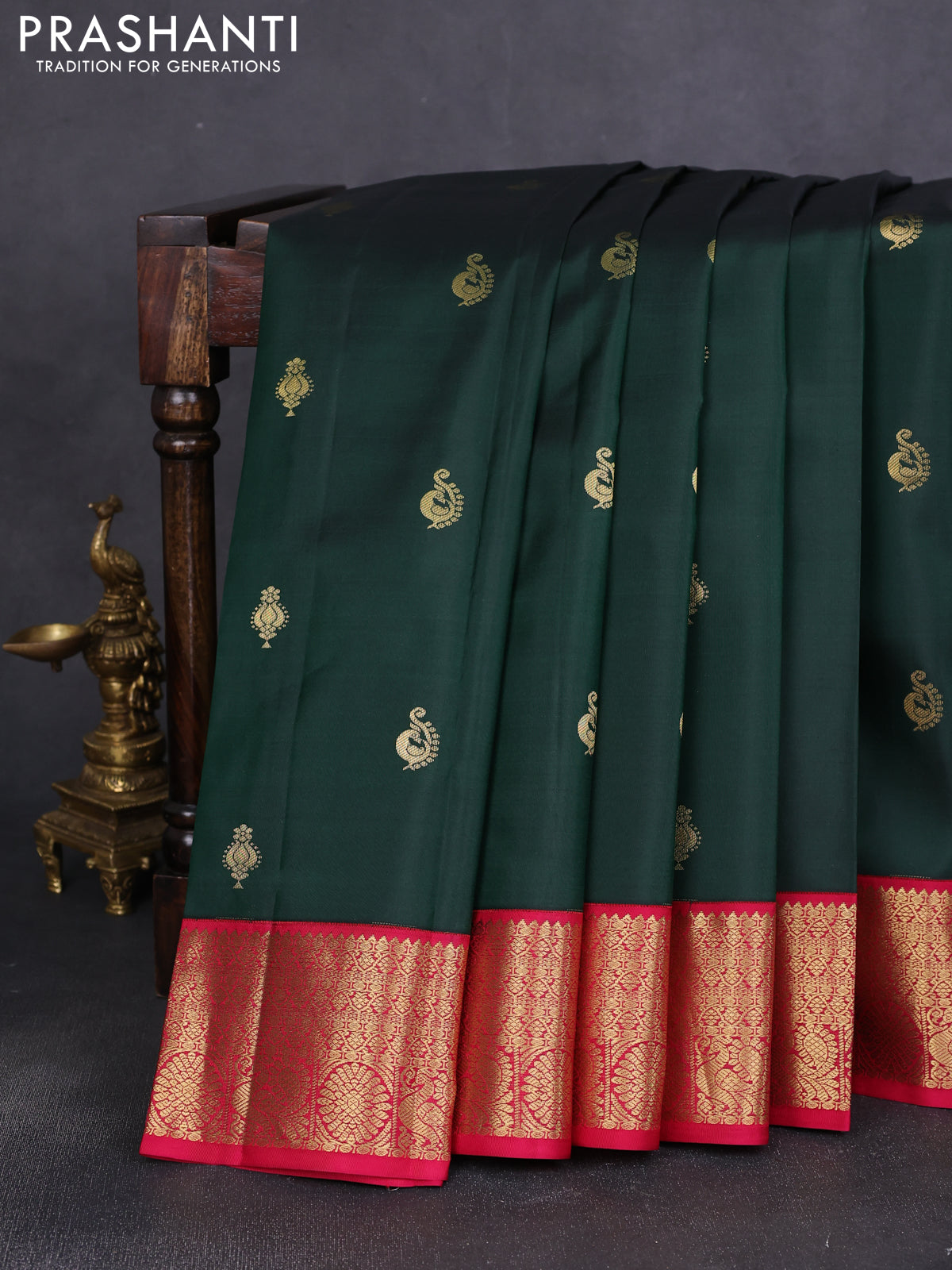 Pure kanchipuram silk saree bottle green and pink with allover zari woven buttas and zari woven korvai border