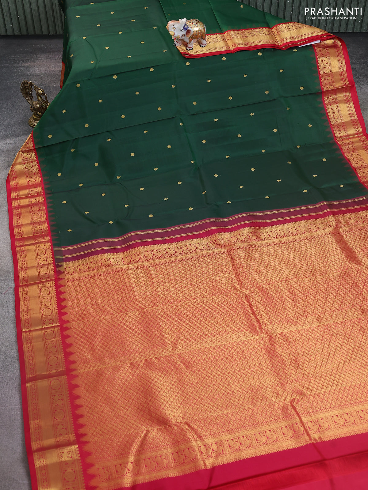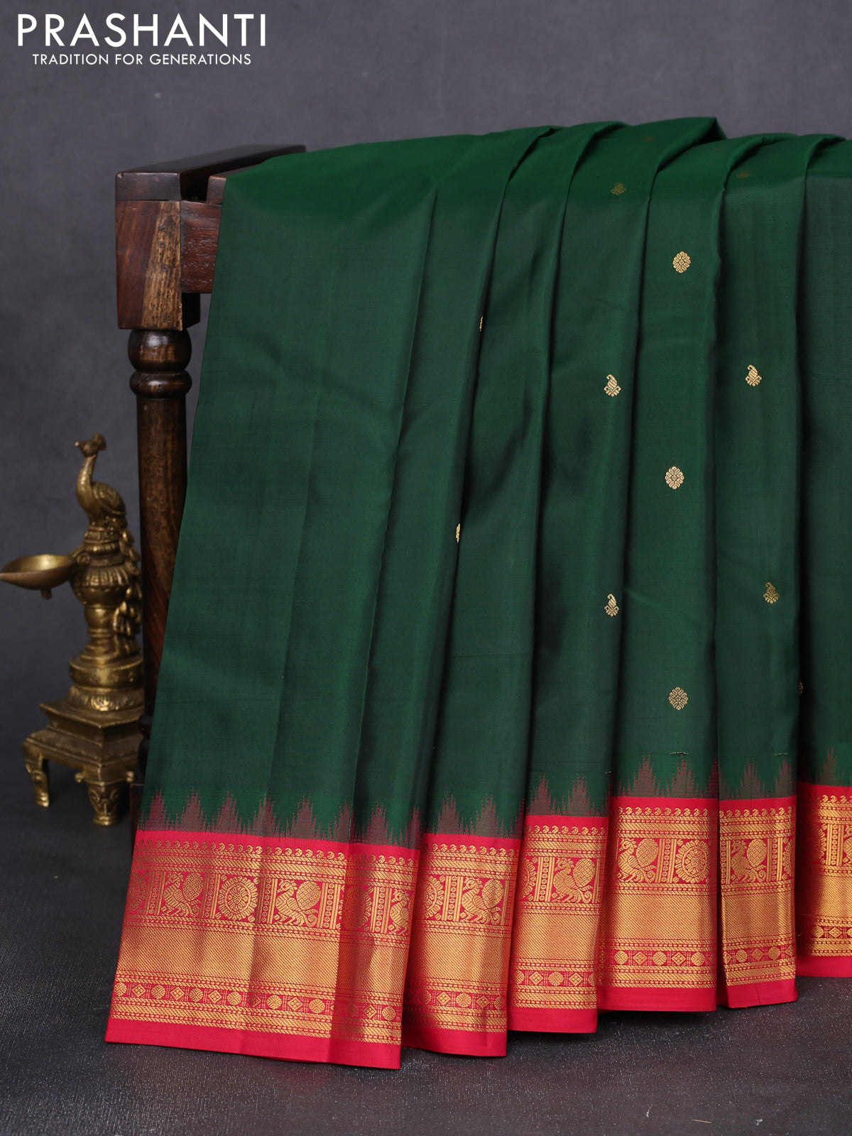 Pure kanchipuram silk saree bottle green and red with zari woven buttas and temple design zari woven border