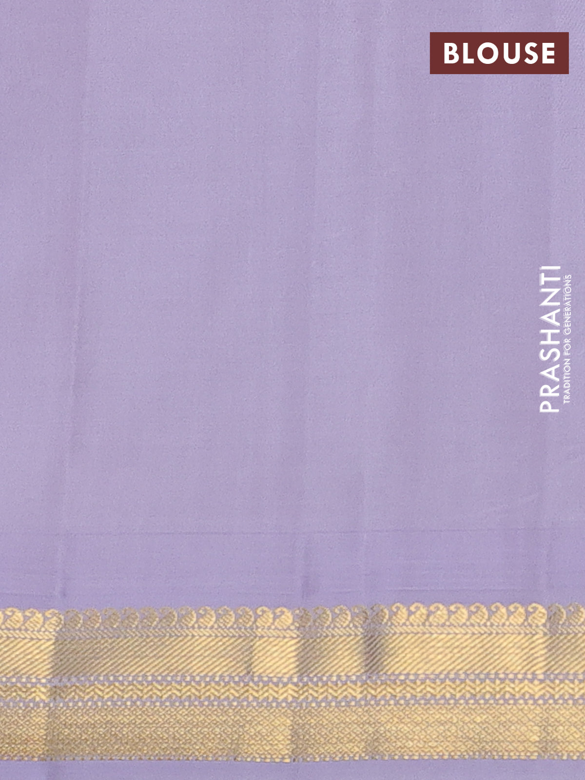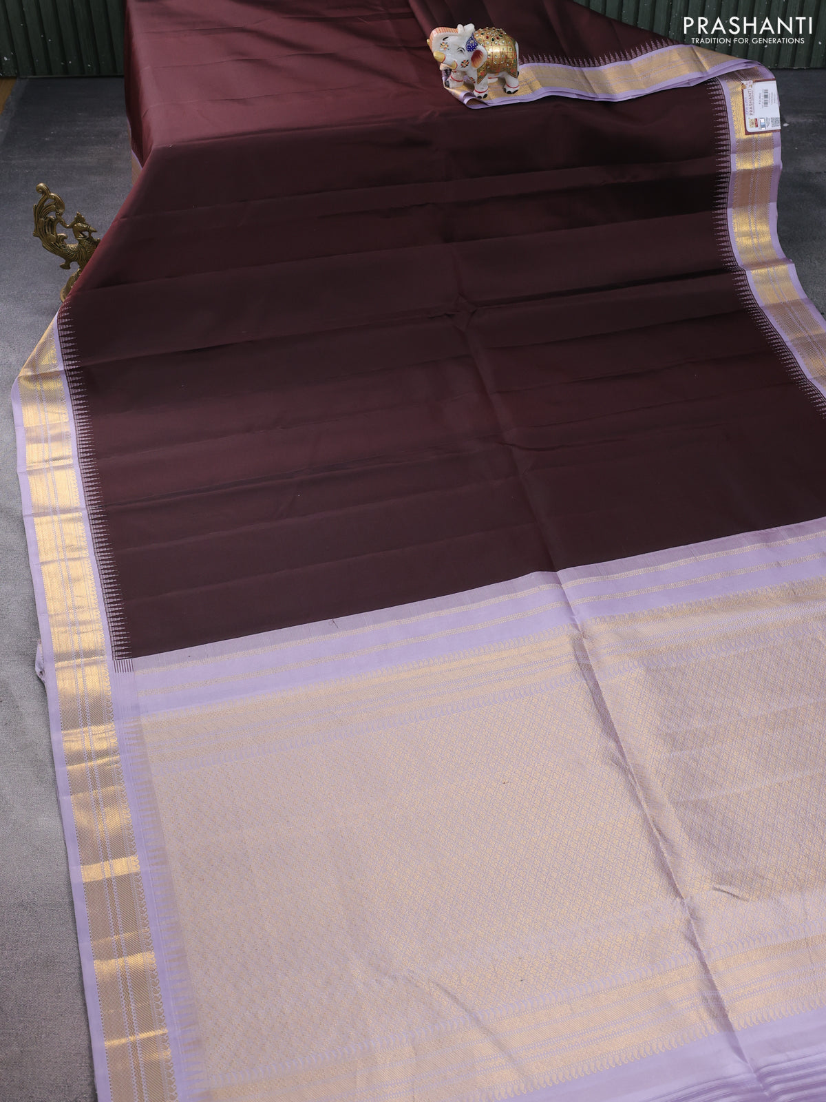 Pure kanchipuram silk saree coffee brown and pastel lavender with plain body and temple design zari woven korvai border