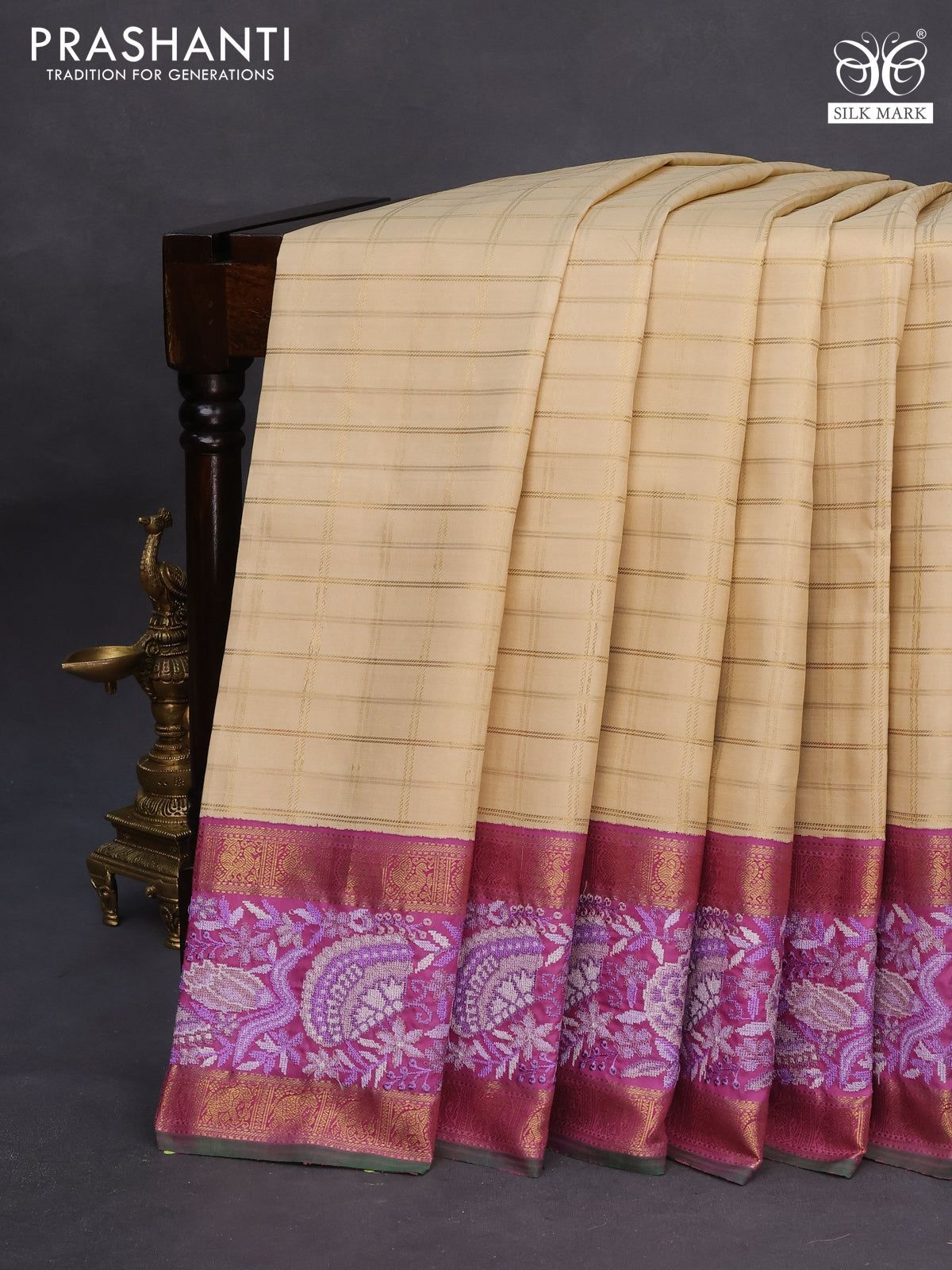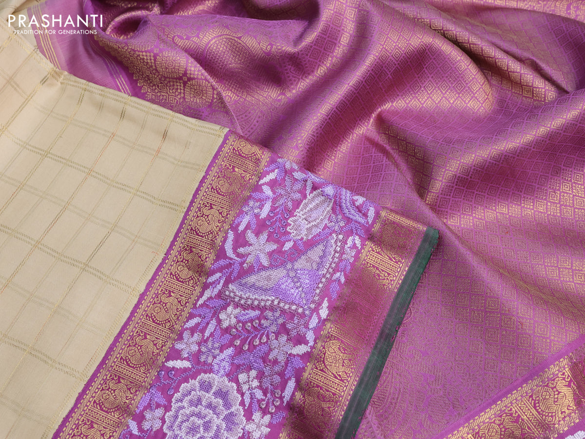 Pure kanchipuram silk saree cream and lavender shade with allover zari checked pattern and embroidery work zari border