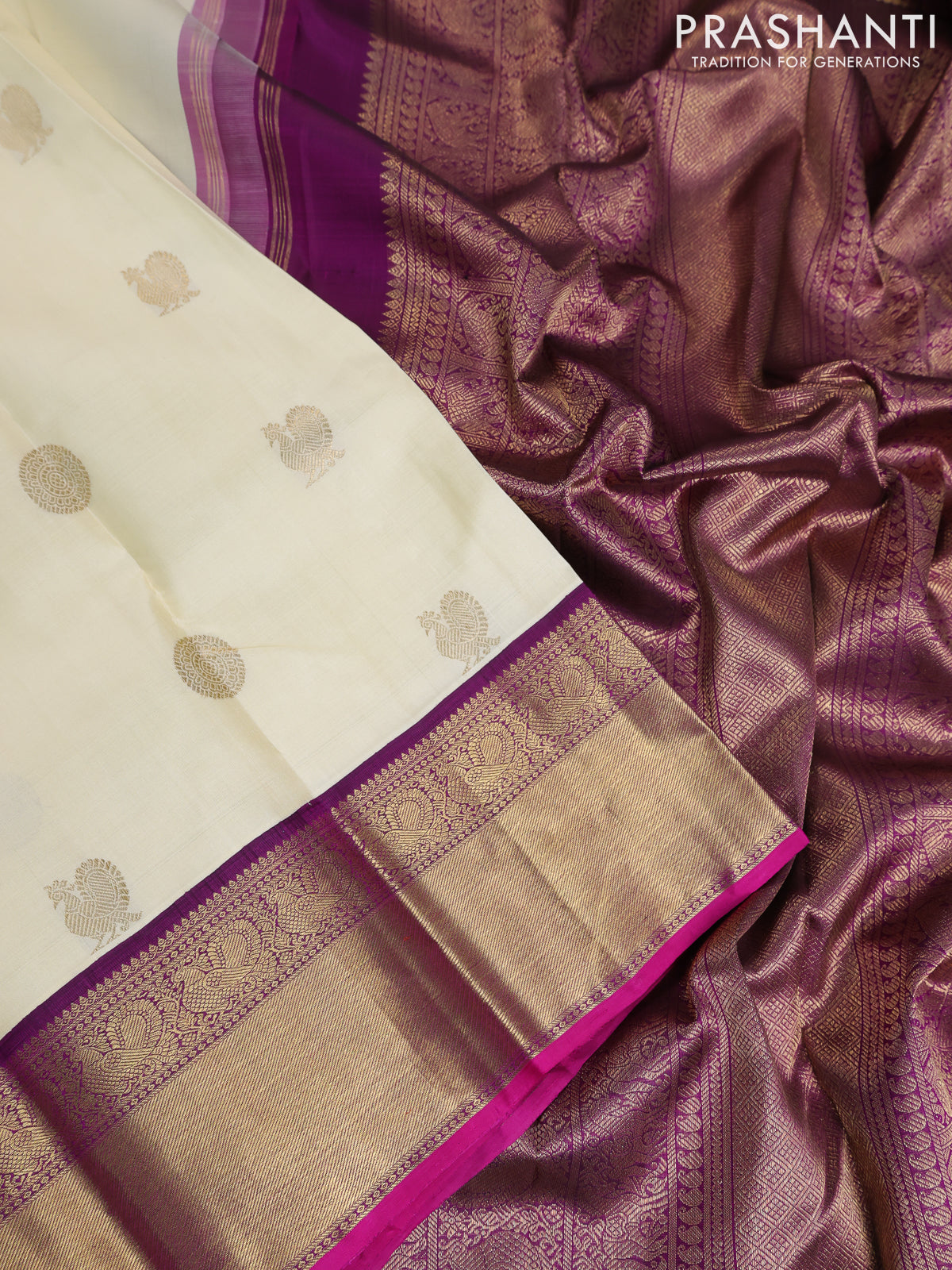 Pure kanchipuram silk saree cream and purple with annam & rudhraksha zari woven buttas and rich zari woven border